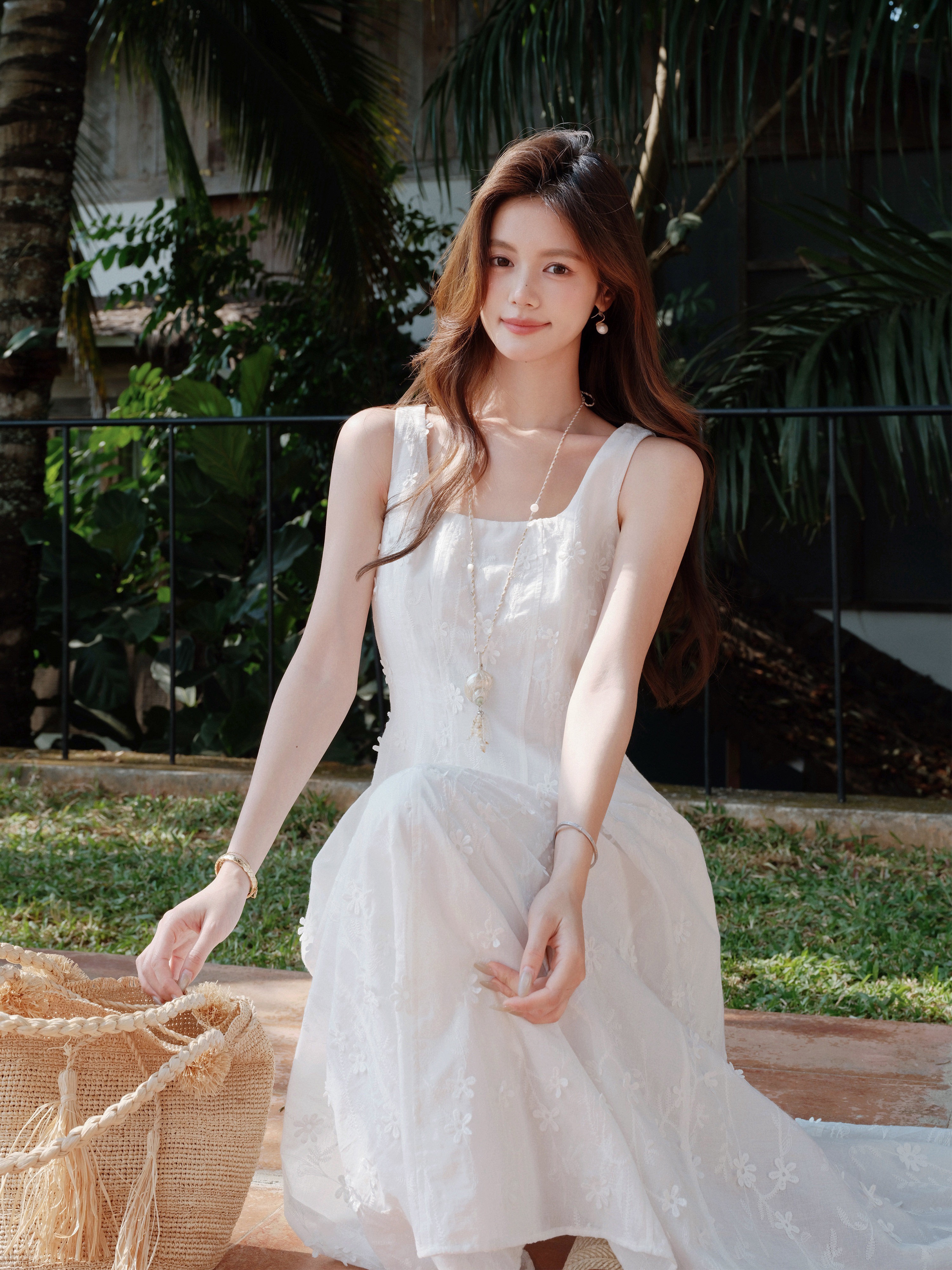 h2an1 studio 丨 맞춤 사쿠라 꽃가루 패치워크 꽃 슬립 드레스 프랑스식 민소매 휴가 롱 스커트