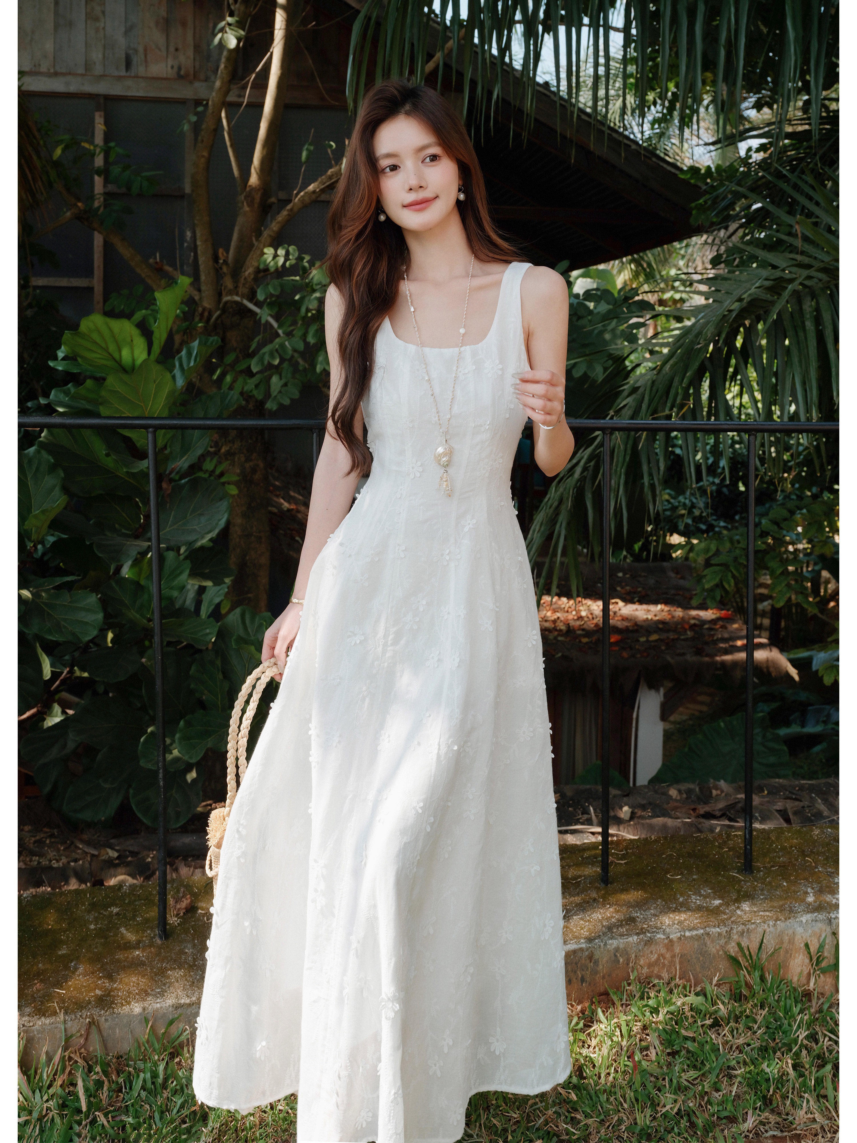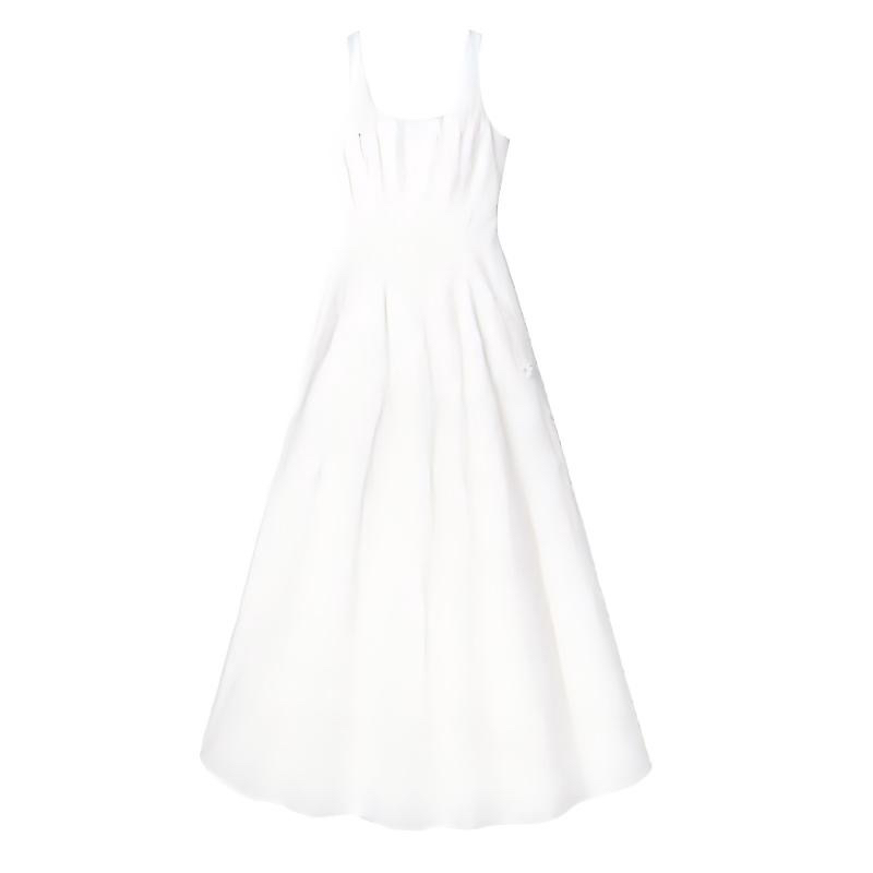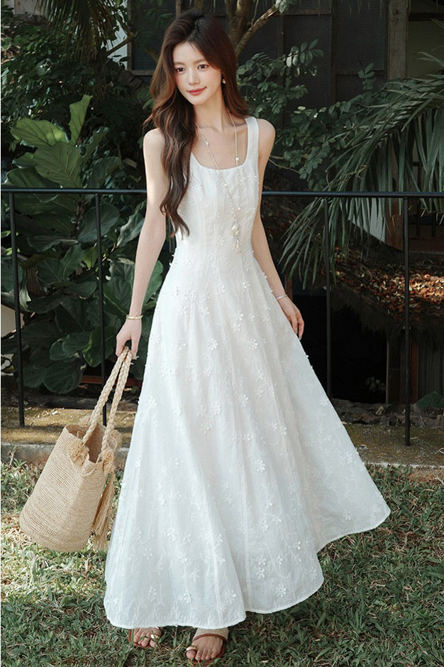 매화 요리 한 구름 객실 달 무거운 작업 전체 너비 3 차원 자수 프랑스식 u 칼라 드레스 화이트 와이드 어깨끈 롱 스커트