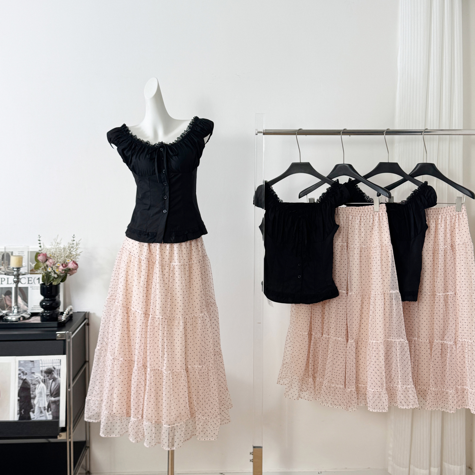 부드러운 바람 검정색 허리 수축 스트랩 반팔 티셔츠 여성 의류 여름 망사 케이크 드레스 도트 무늬 반신 스커트 투피스 세트
