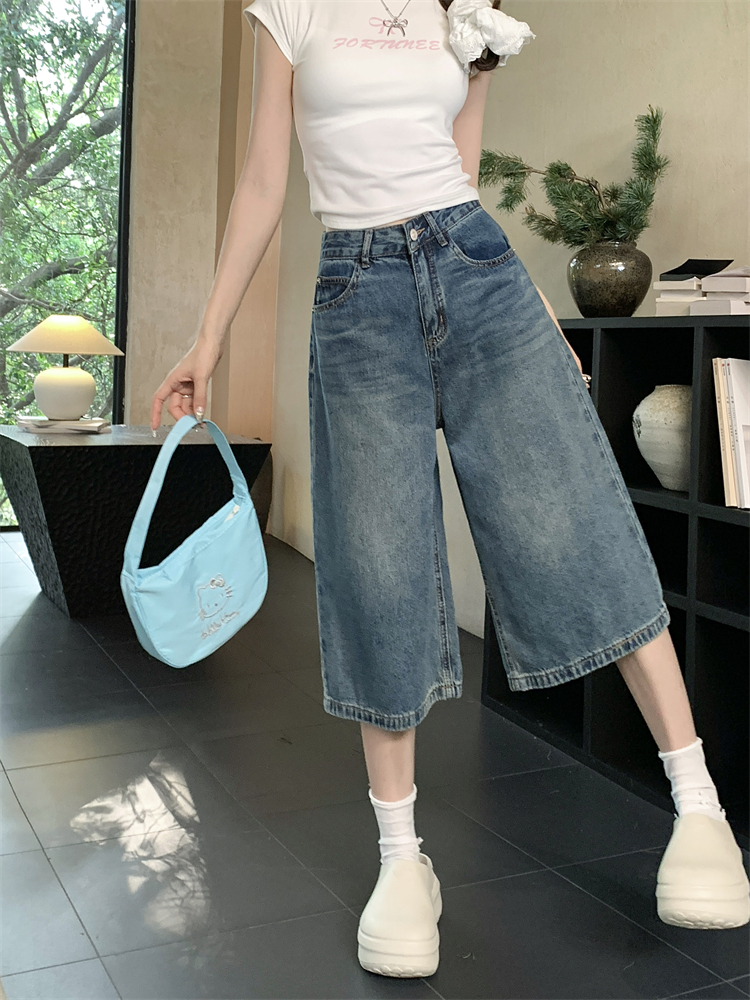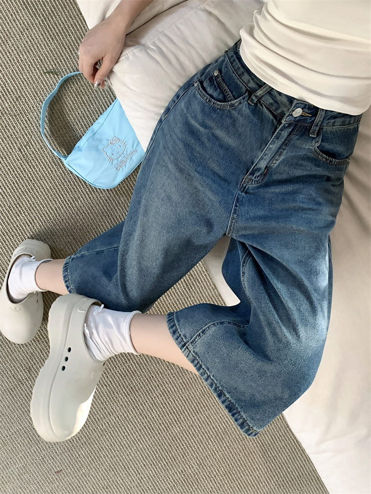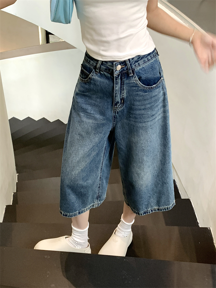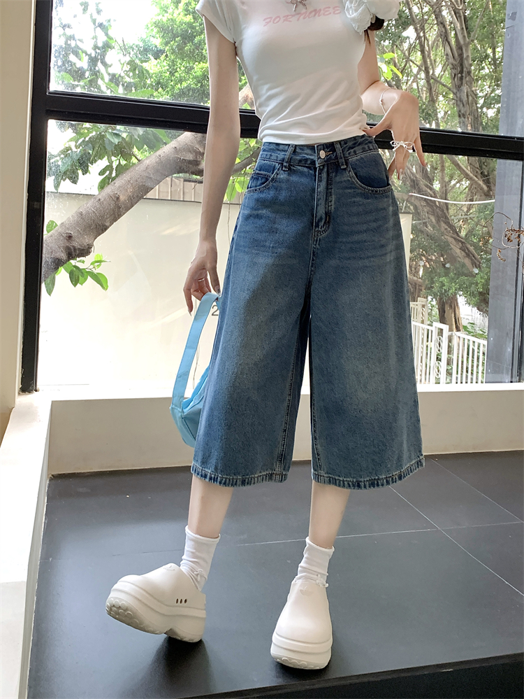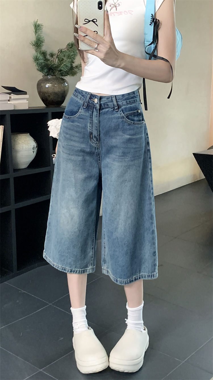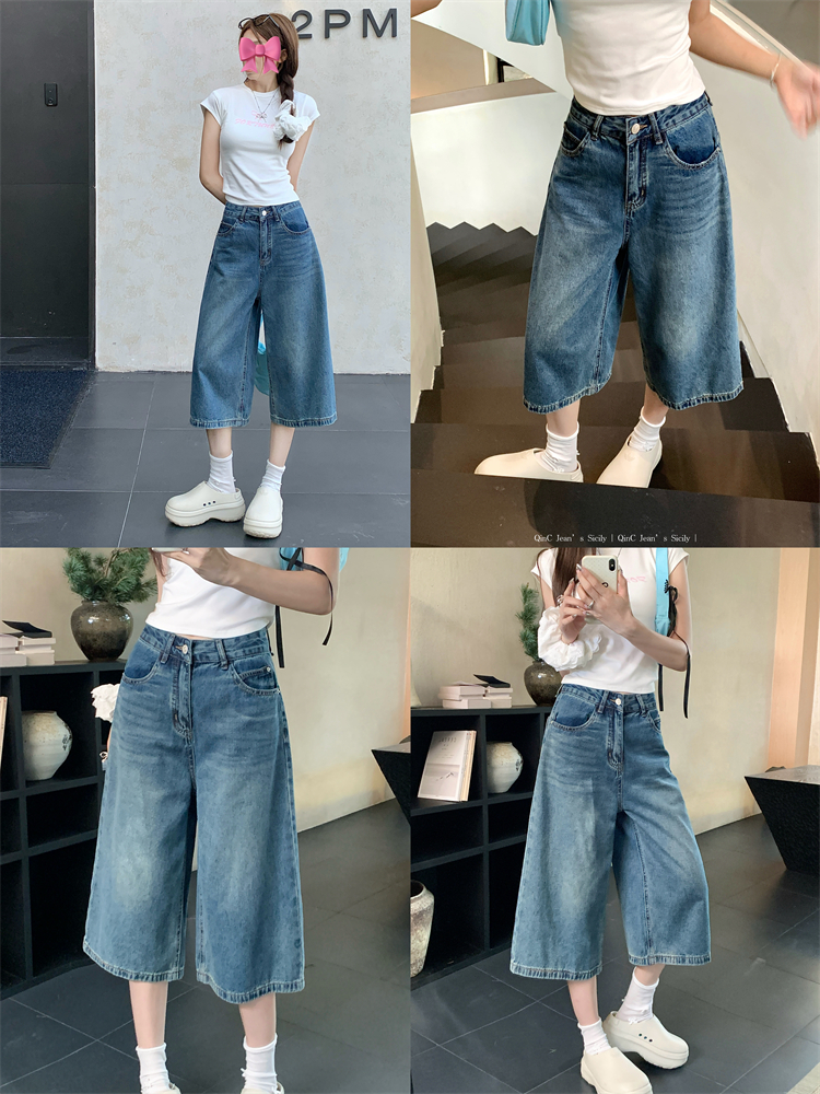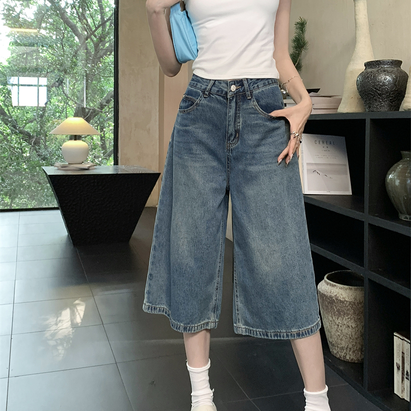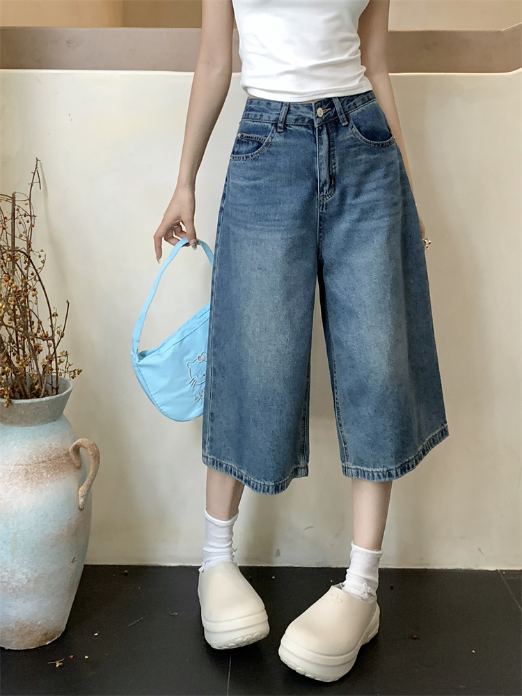 실사 빅 사이즈 아메리칸 레트로 블루 워싱 데님 넓은 다리가 짧다. 바지 루즈핏 캐주얼 바지 다용도 스트레이트 7부 바지