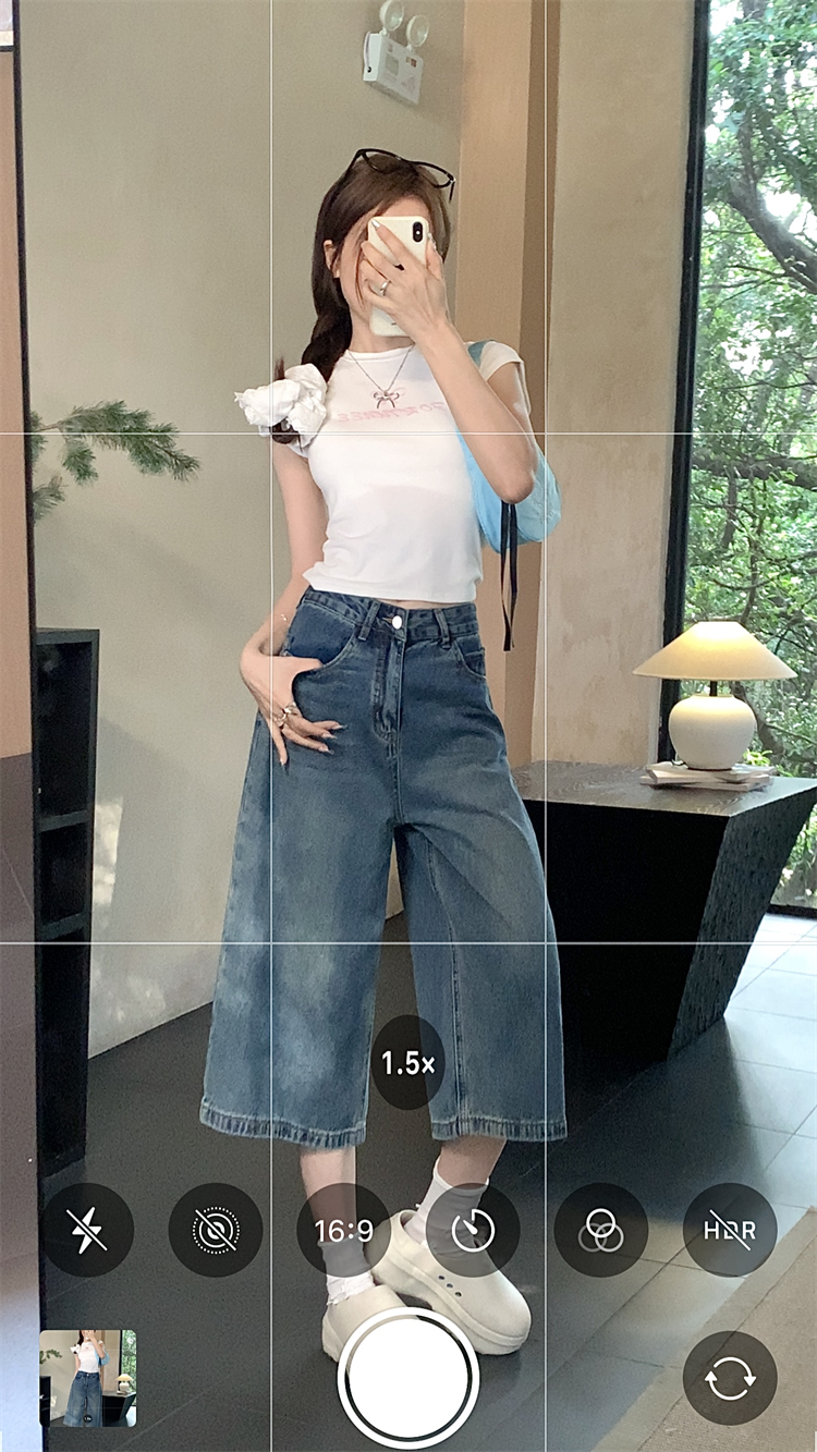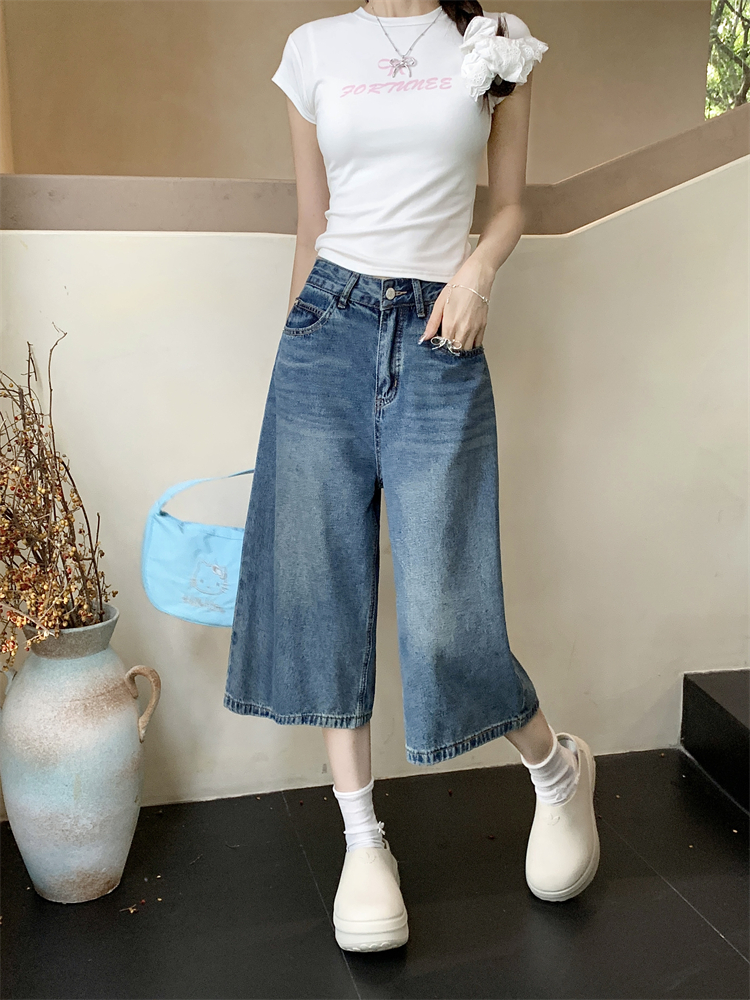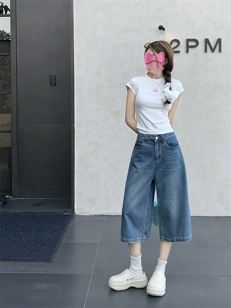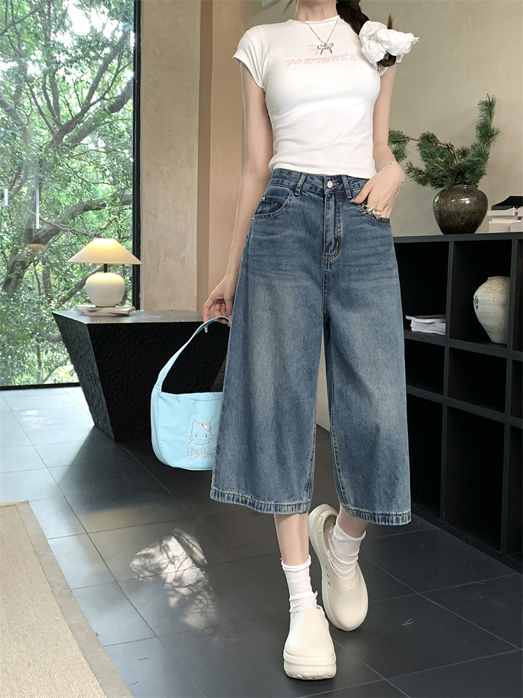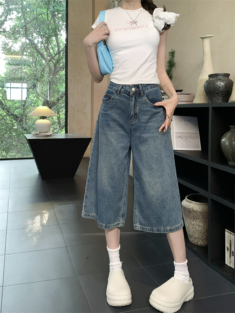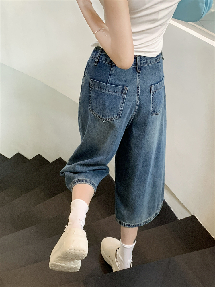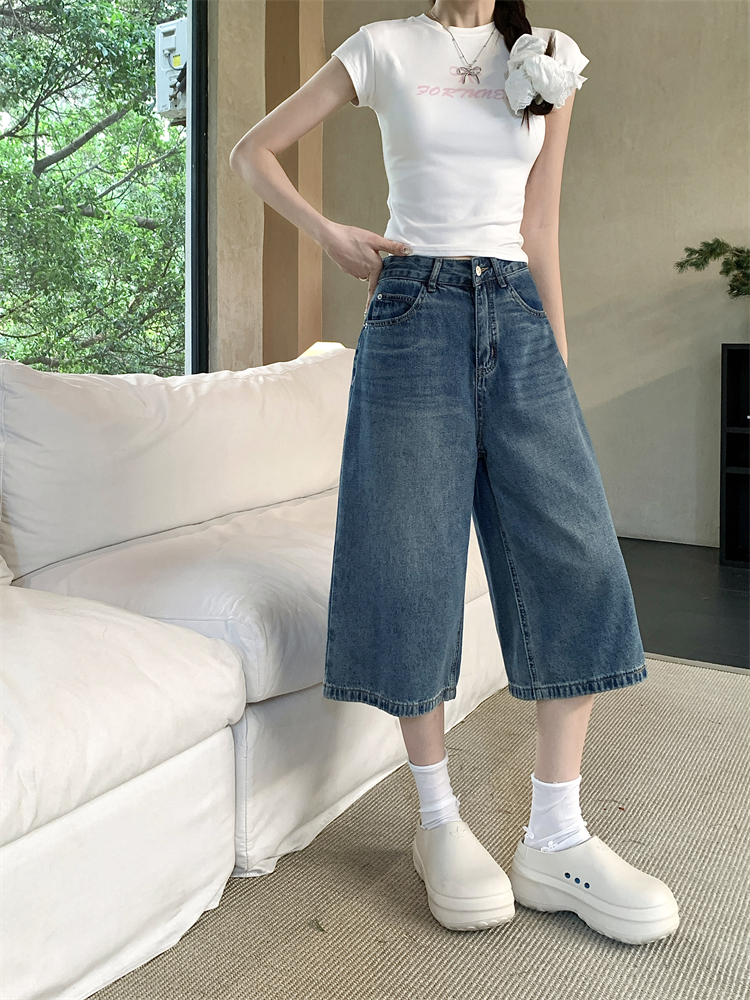 실사 빅 사이즈 아메리칸 레트로 블루 워싱 데님 넓은 다리가 짧다. 바지 루즈핏 캐주얼 바지 다용도 스트레이트 7부 바지