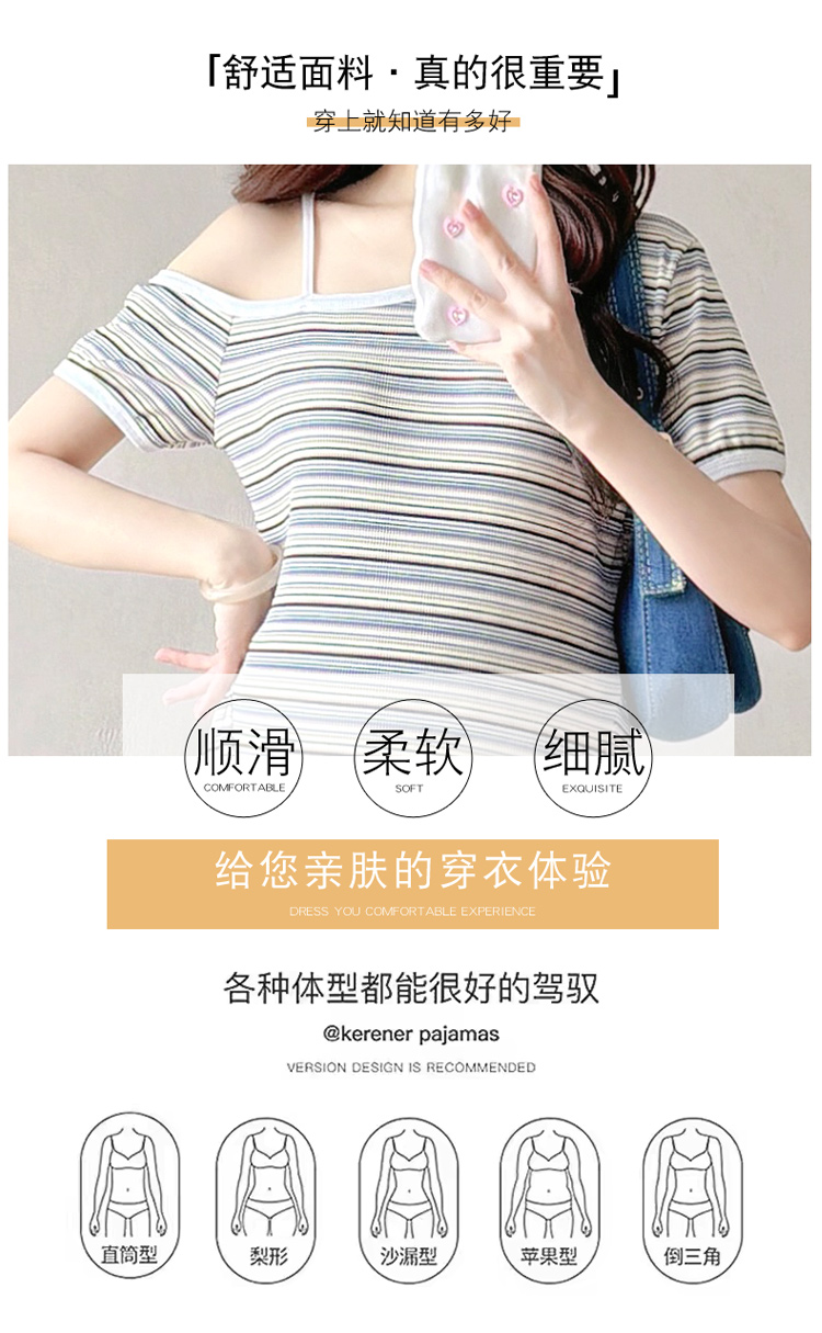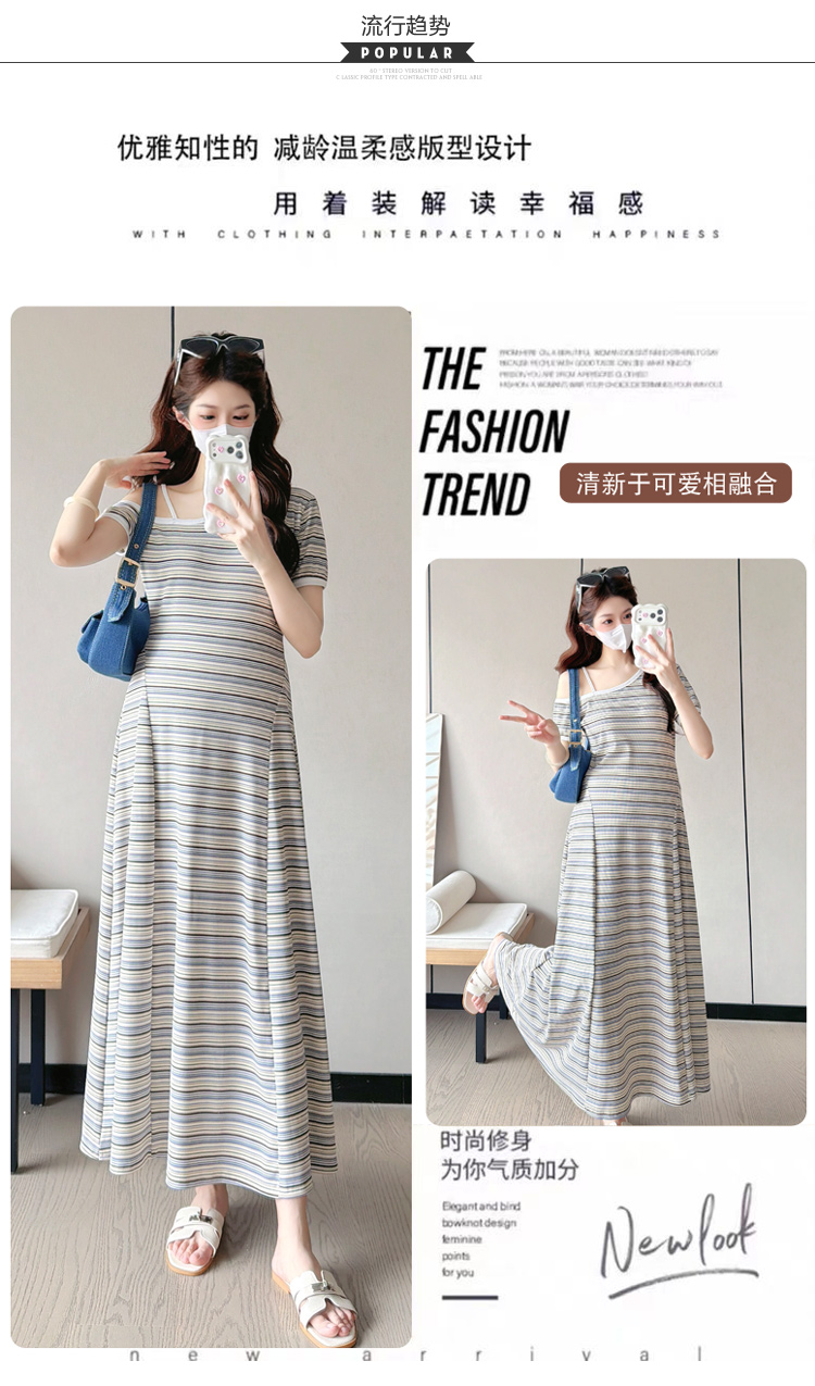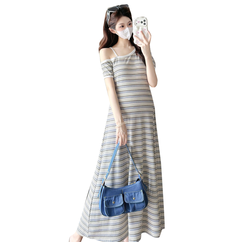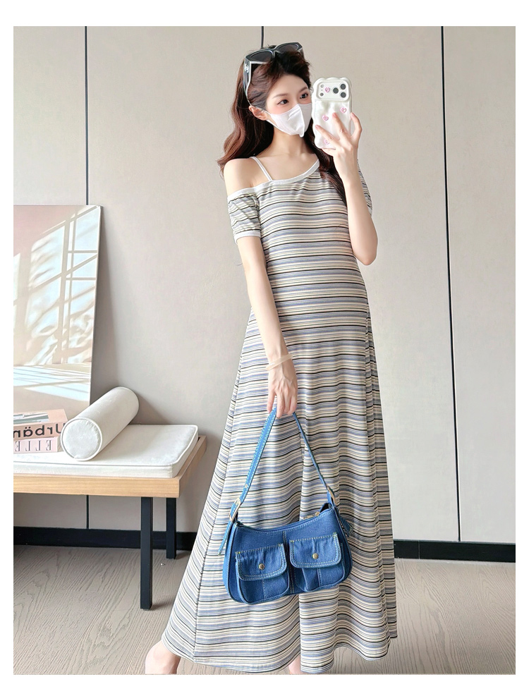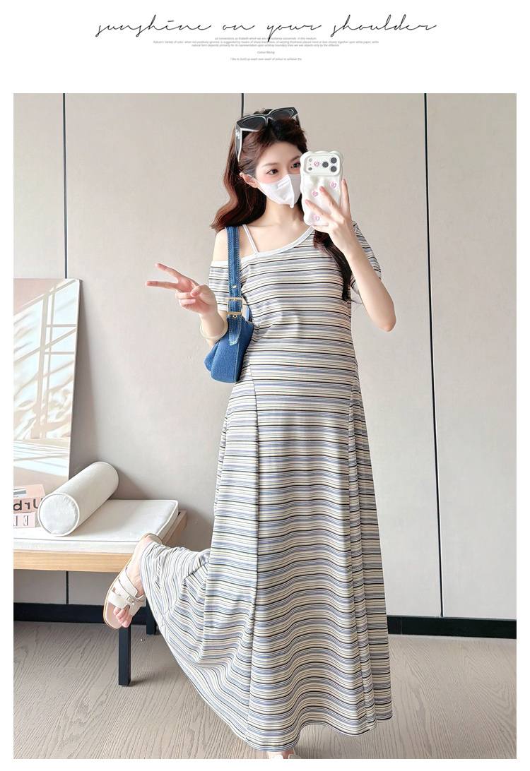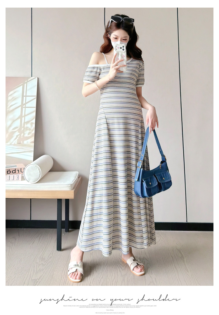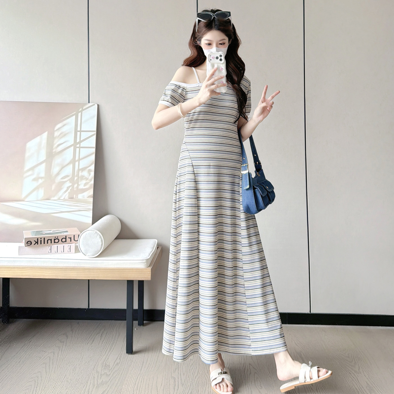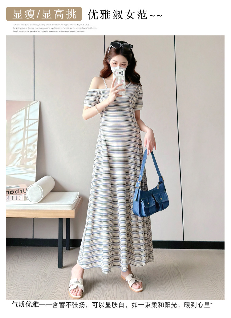 실사 2026 출산 착용 여름 새로운 스트라이프 오프숄더 몸매 가꾸기 슬림해 보이는 드레스