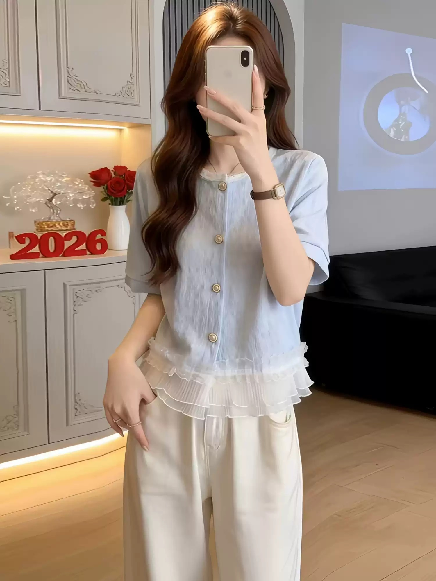 슈퍼 잘 생긴 주름 프릴 셔츠 여성용 짧은 소매 2026 새로운 루즈핏 외국 가스 라운드 넥 거품 소매 작은 셔츠 맨위