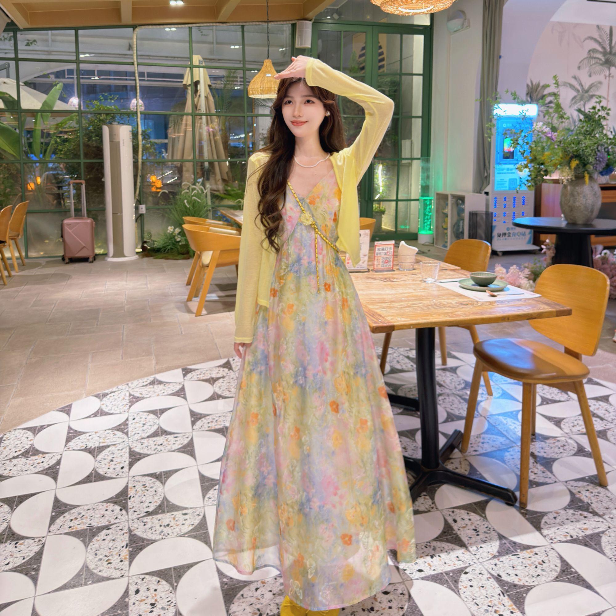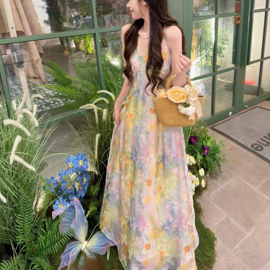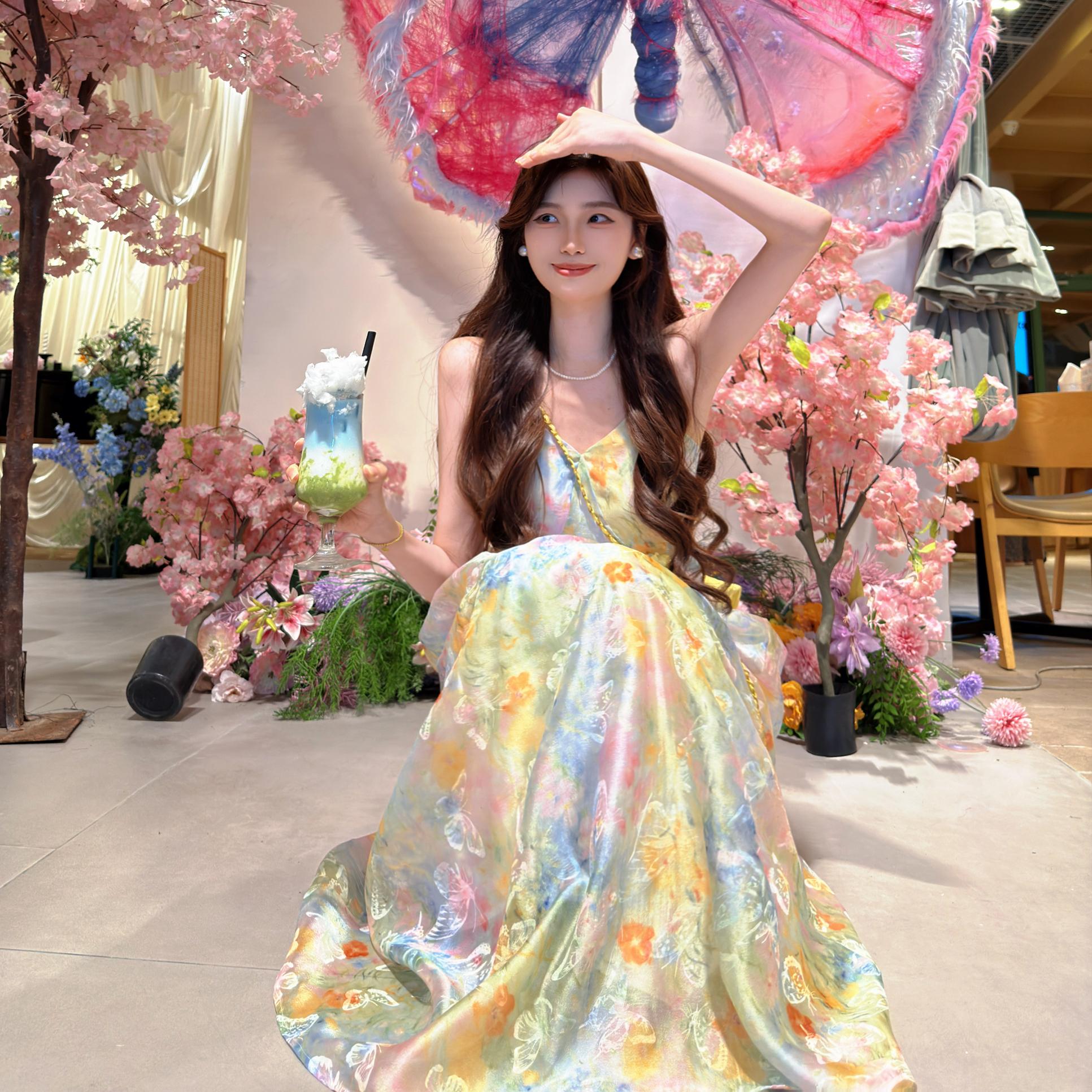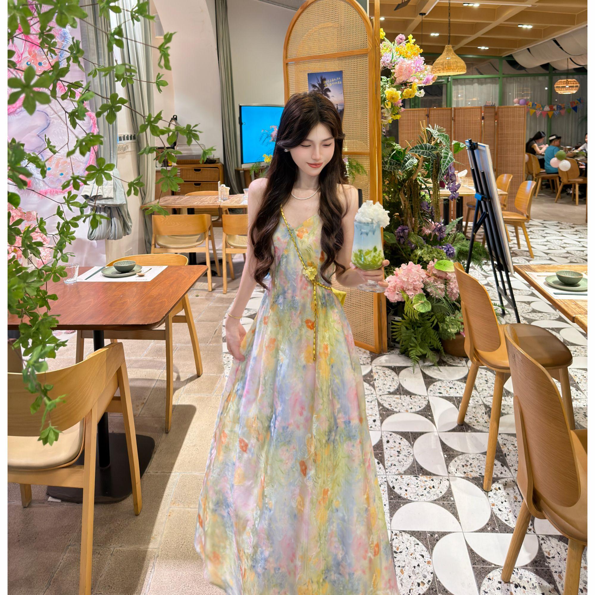 빅 사이즈 프랑스식 레트로 슬립 여성 드레스 여름 허리 수축 슬림해 보이는 롱 스커트 해변가 휴가 해변 드레스