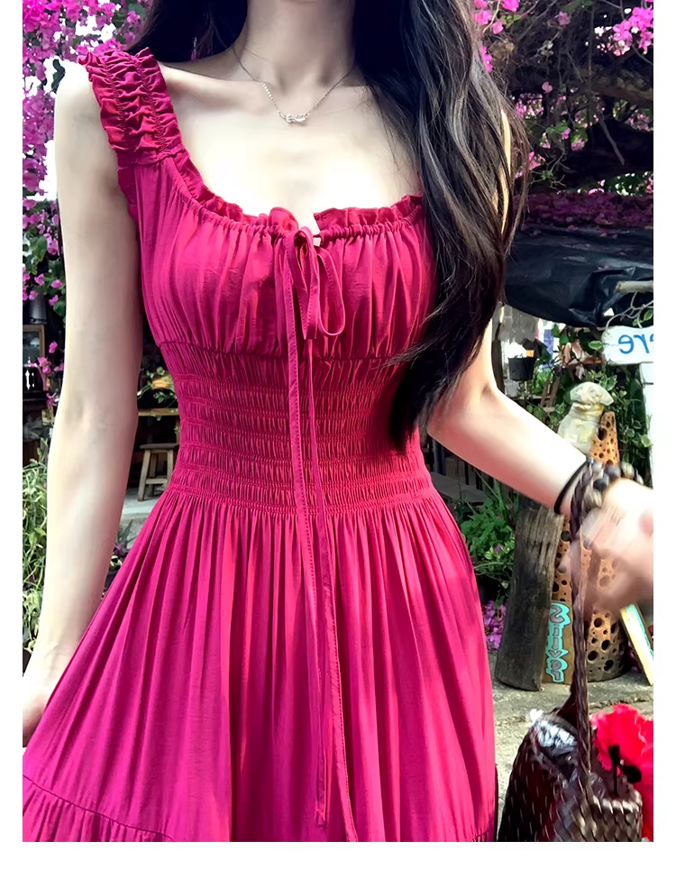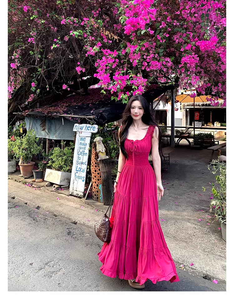 실사 빅 사이즈 프랑스식 차 휴식 부드러운 품격 V넥 여성 드레스 허리 수축 슬림해 보이는 디자인 센스 해변 롱 스커트