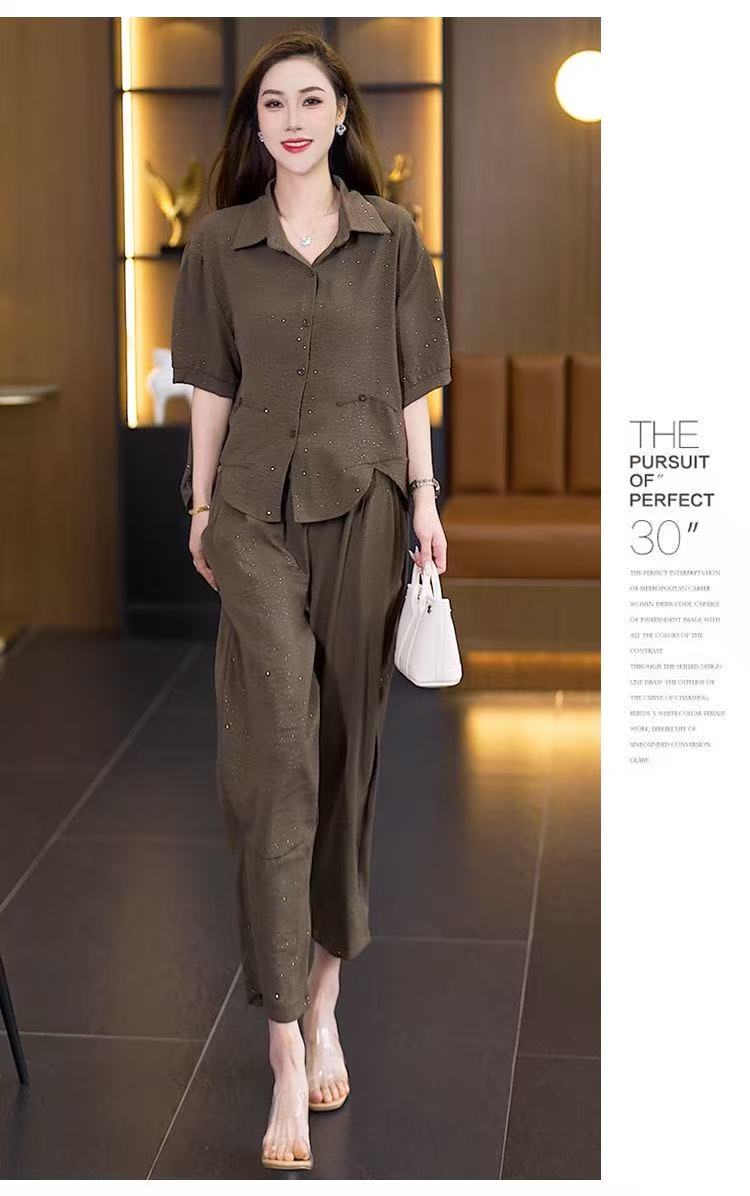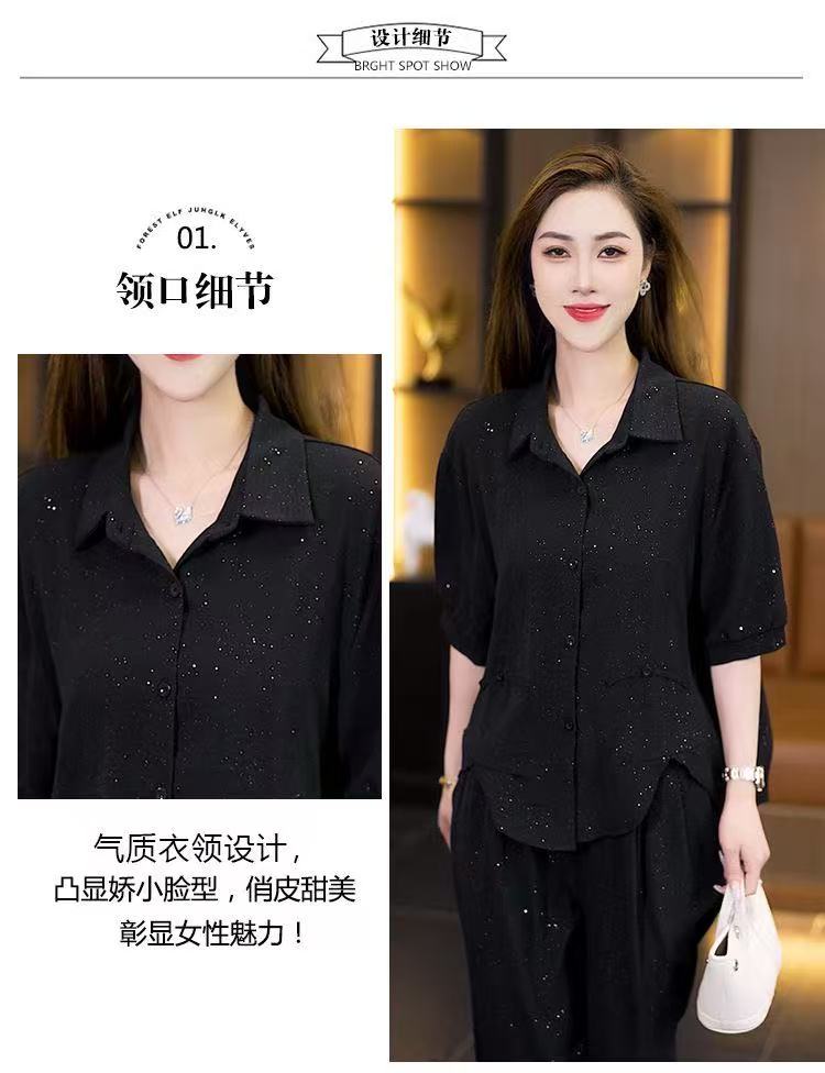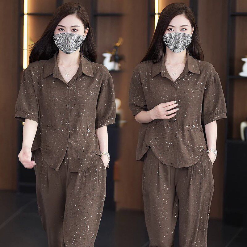 실사 2026 여름 작은 키 루즈핏 슬림해 보이는 면 린넨 중식 자카드 맨위 캐주얼 하렘 바지 세트 여성
