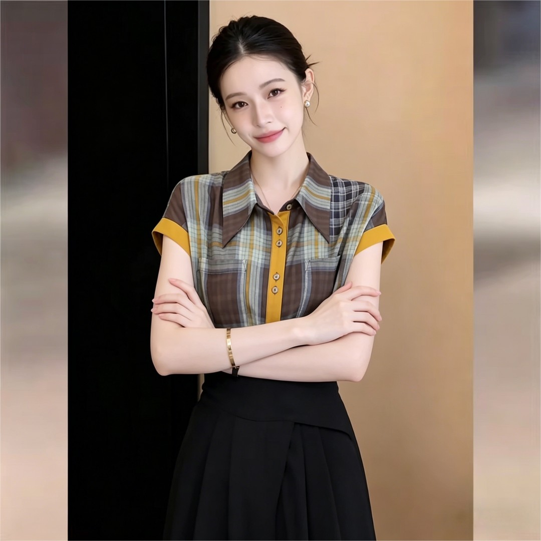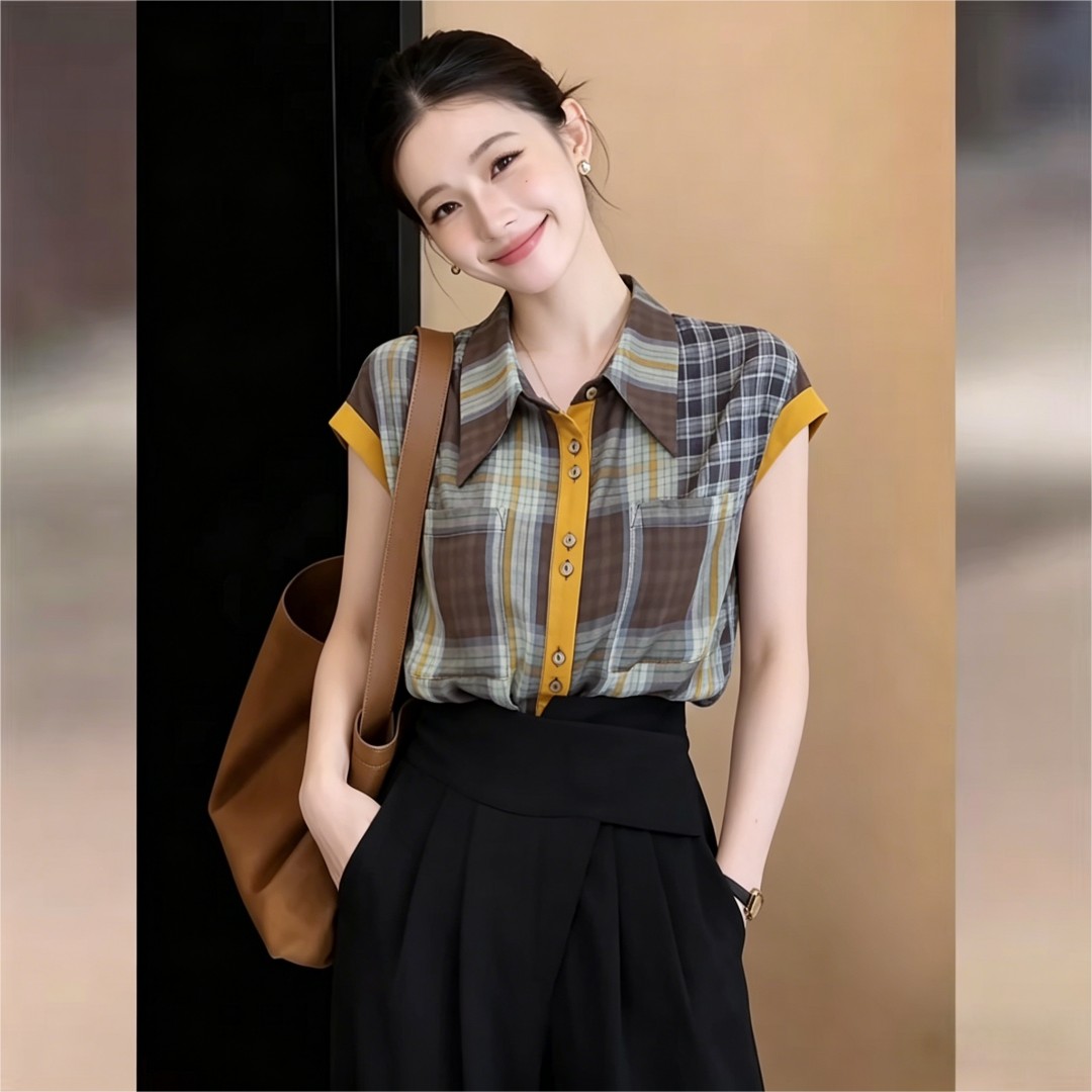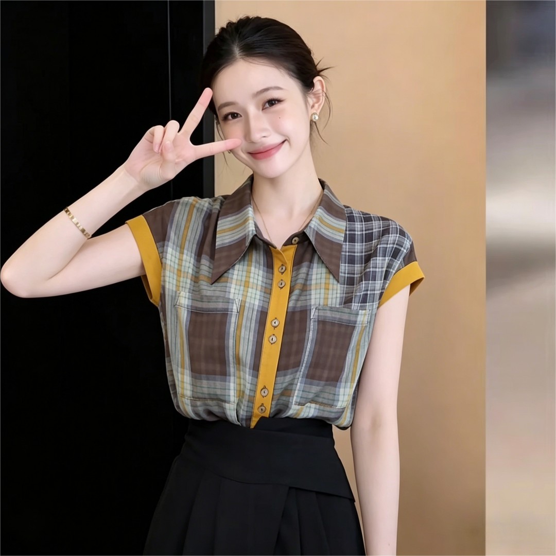 실사 한국 스타일 미니멀리즘 레트로 센스 체크무늬 얇고 가벼운 여성 셔츠 2026 여름 새로운 느슨함 센스 배색 셔츠 트렌디