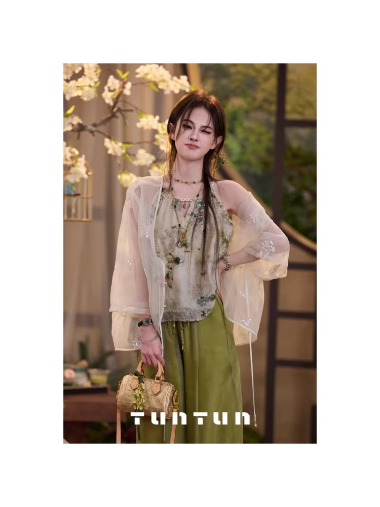 삼키기 tunt 봄 여름 청 이슬 빛 럭셔리 깃발 새로운 중식 무거운 작업 단추 구슬 자수 오픈 가디건 스택 착용 블라우스