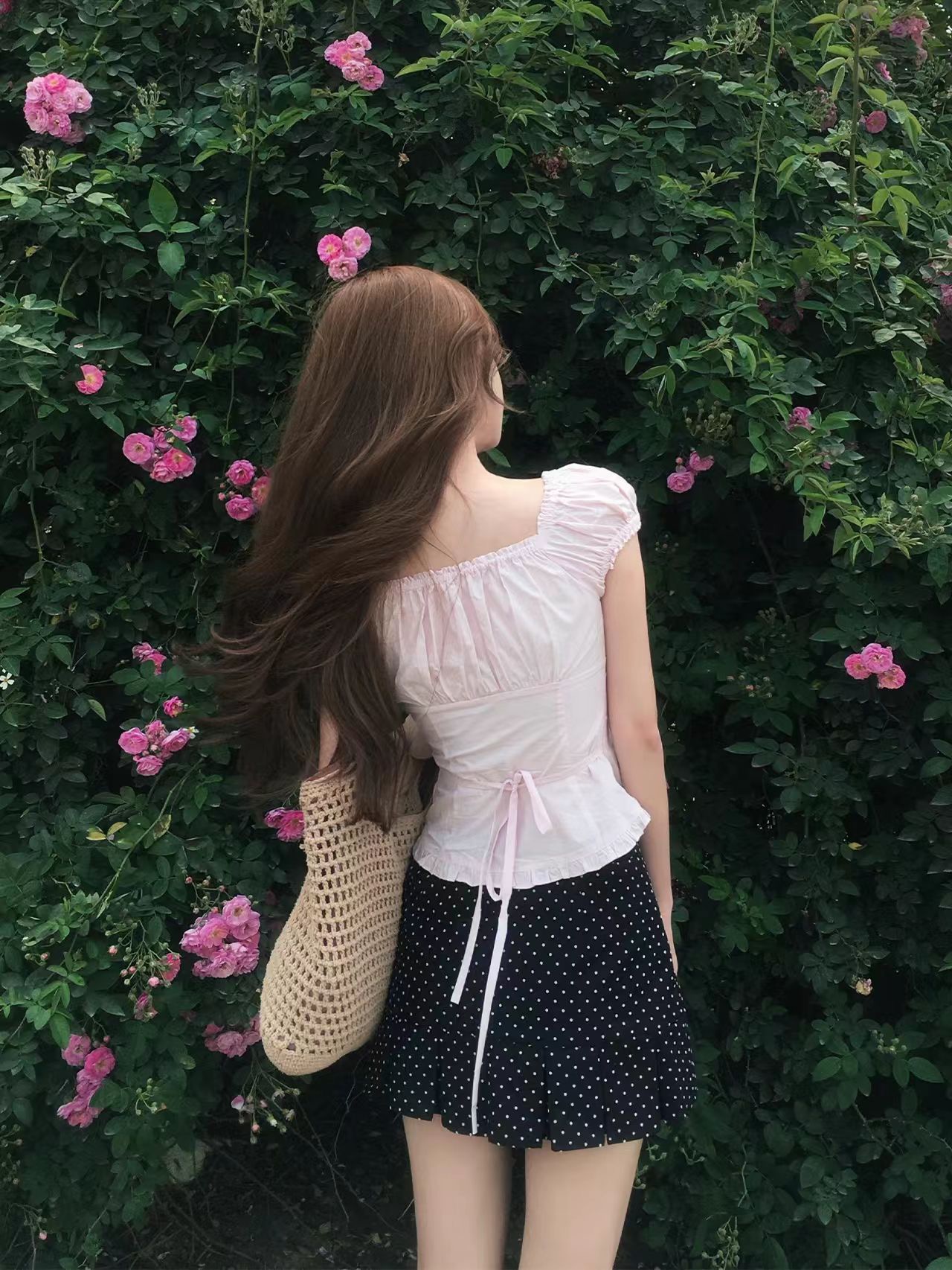 popwest 丨 홀로우 아웃 광장 칼라 오프숄더 거품 소매 작은 셔츠 나비 매듭 레이스 셔츠 미니 스커트 세트