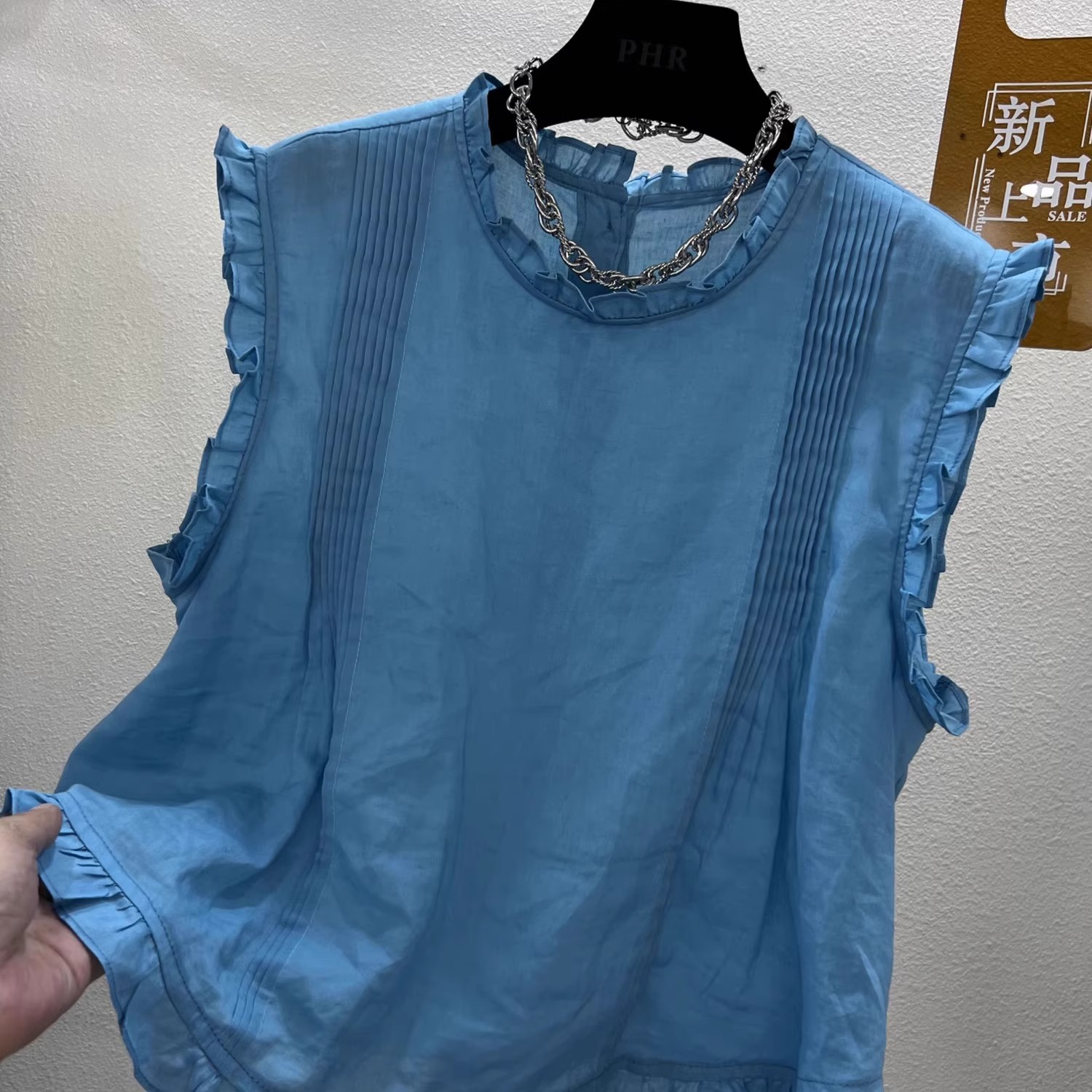 2026 년 여름 새로운 라운드 넥 프릴 플리츠 패션 Feifei 소매 조끼 셔츠 여성 셔츠