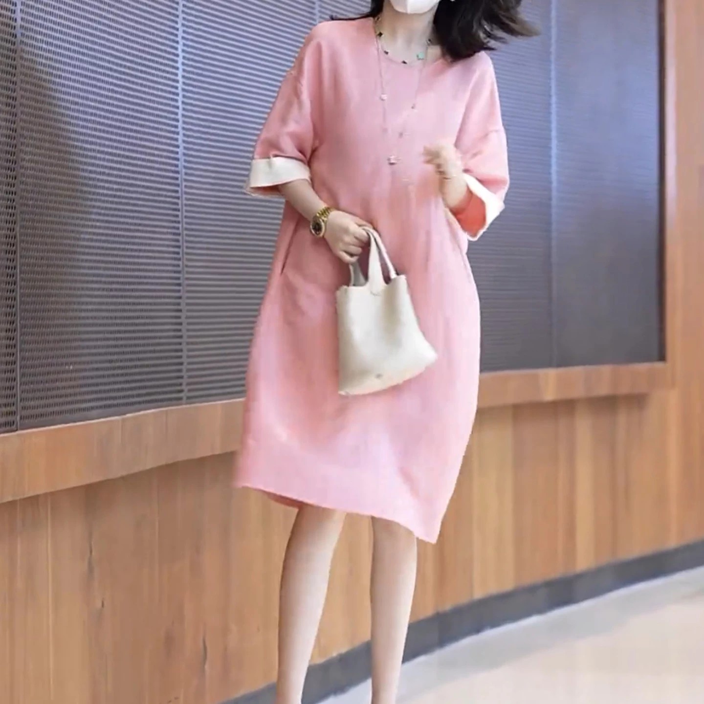 미니멀리즘 루즈핏 아마 물 핑크색 패치워크 색상 중간 길이 반팔 2026 여름 새로운 여성 드레스 출퇴근