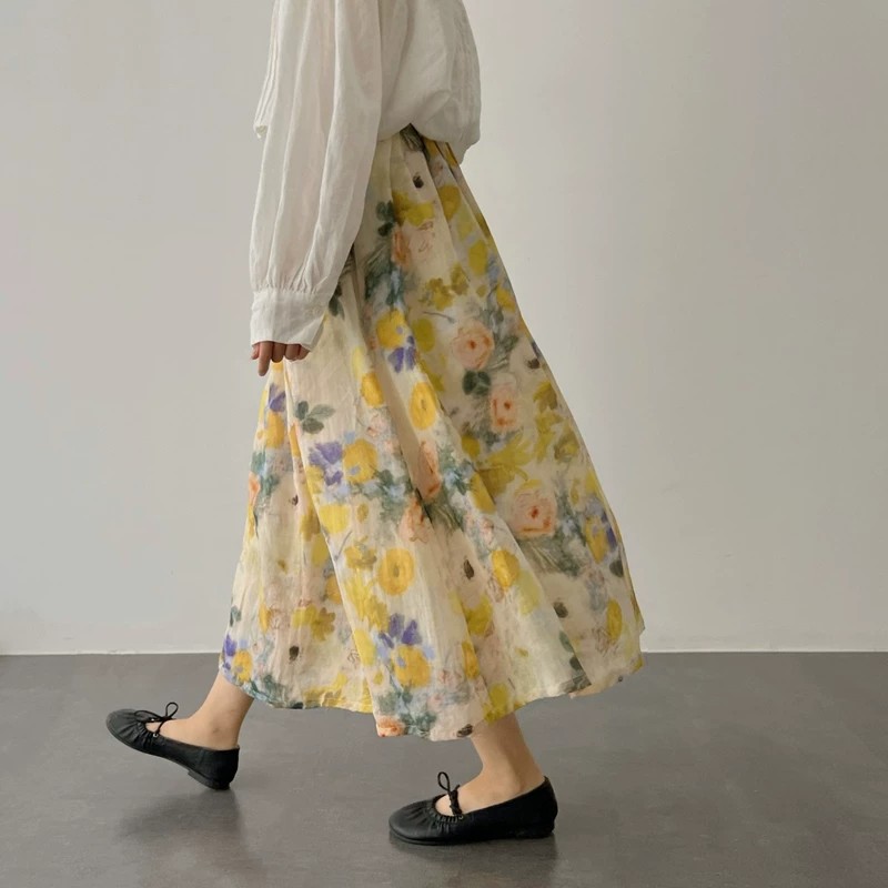 3929 재고 있음 순면 프린트 원단 프랑스식 유화 바람 꽃무늬 반신 스커트 여성 26 새로운 부드러운 바람을 피우다 롱 스커트