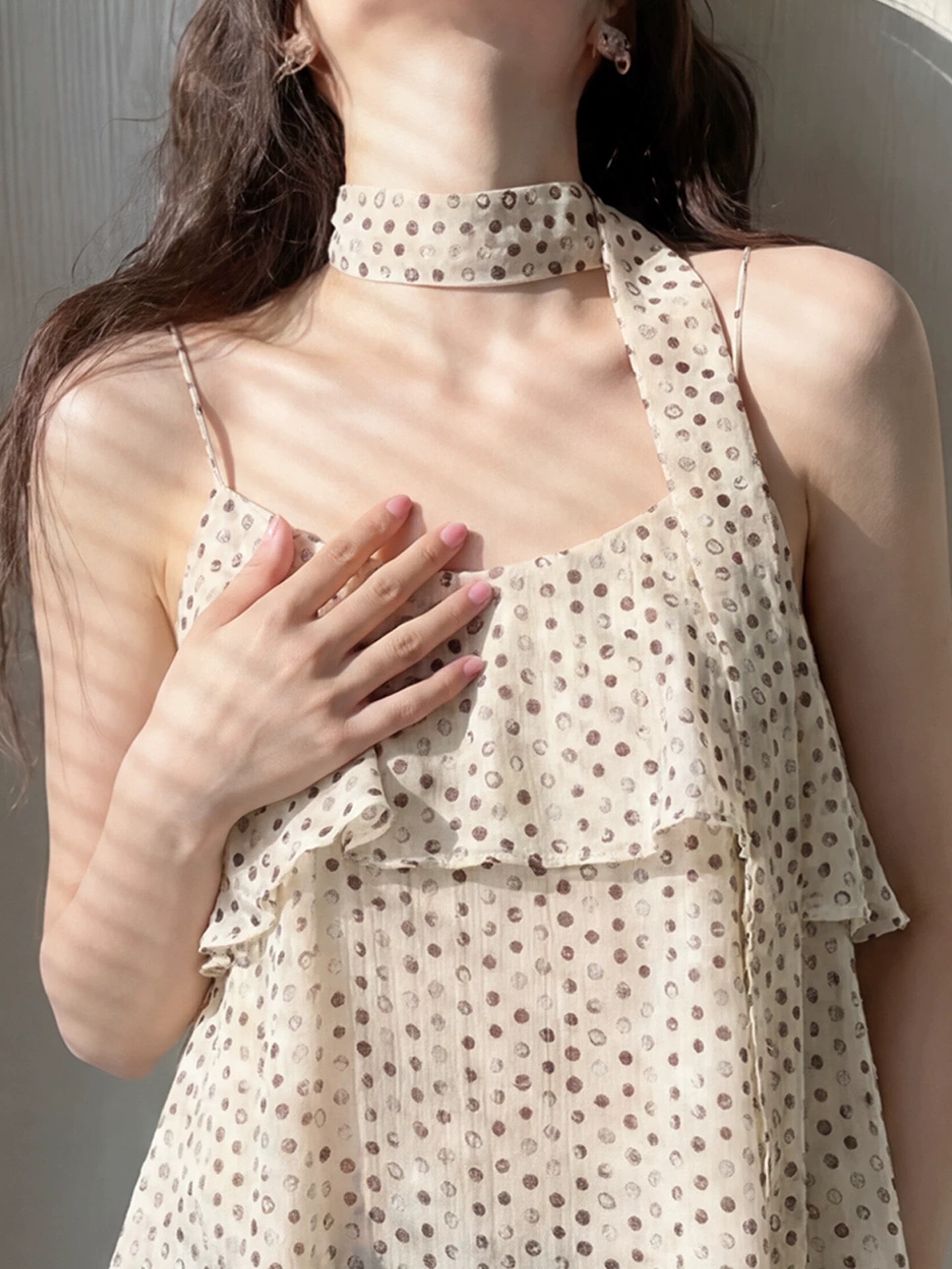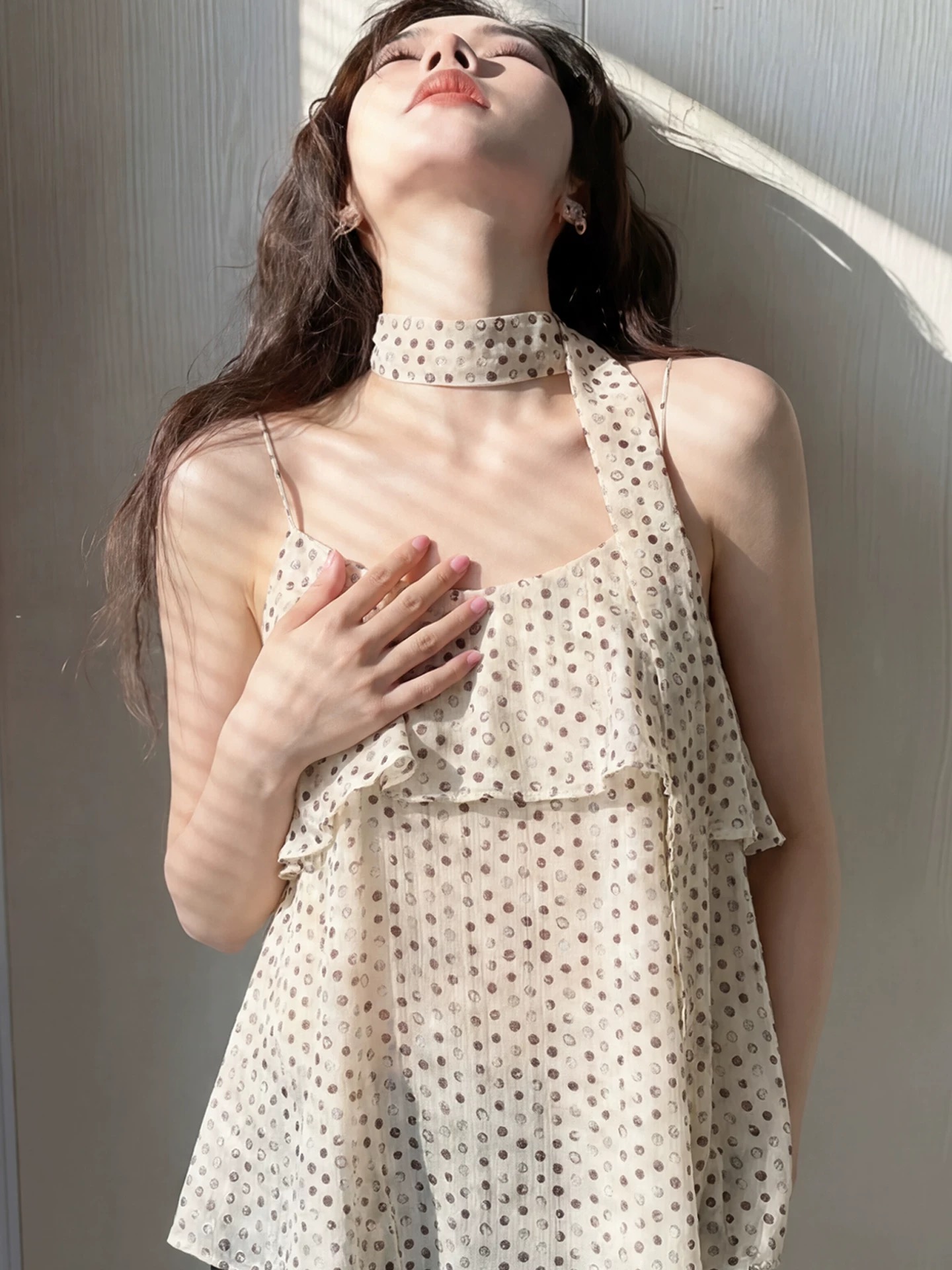 디자인 센스 살구 색상 도트 무늬 행침 목 민소매 작은 슬링 여성 여름 고유 한 아름다운 작은 키 외출용 조끼 맨위
