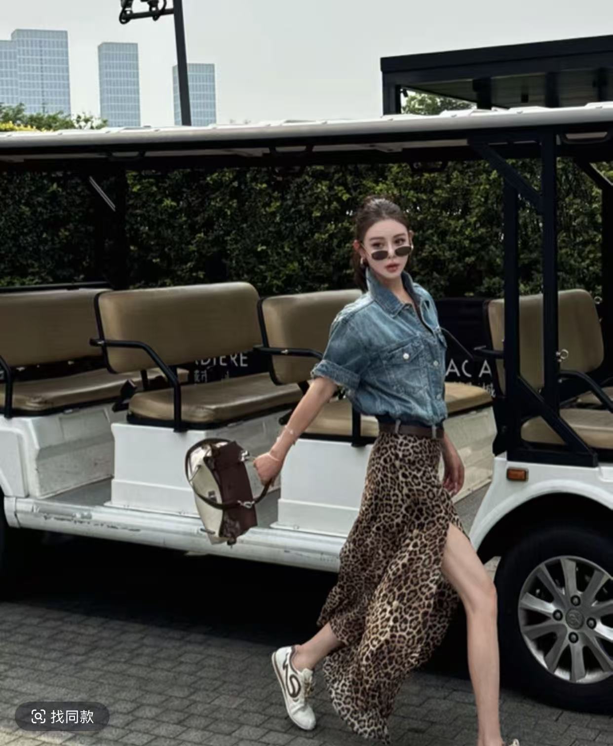 qz38 에 따르면 아름다움 딩 불규칙 측면 트임 가스 질감 레오파드 무늬 반 스커트 데님 셔츠