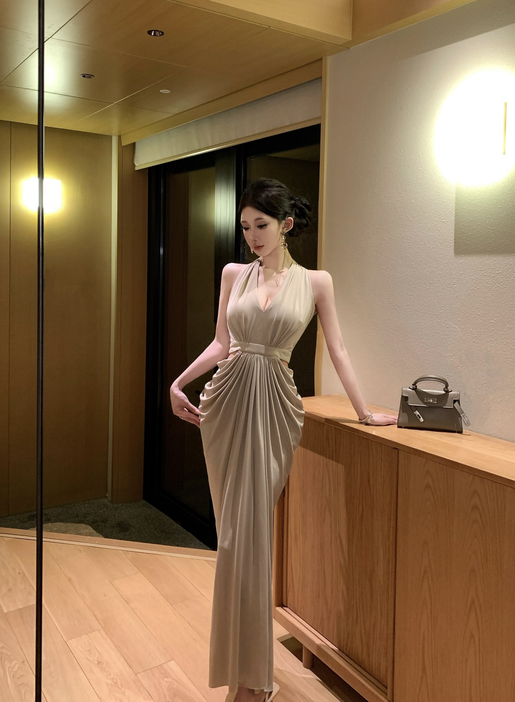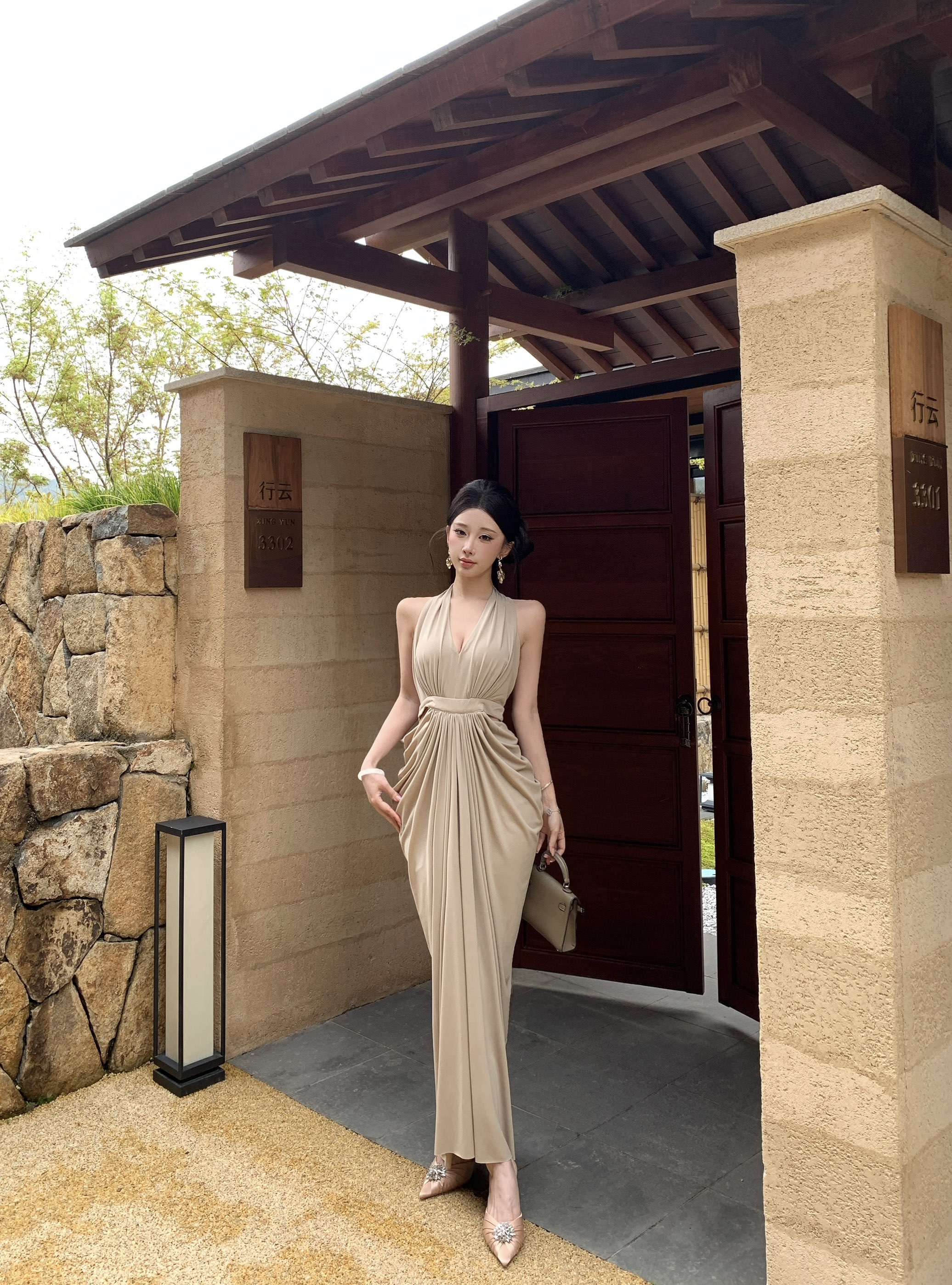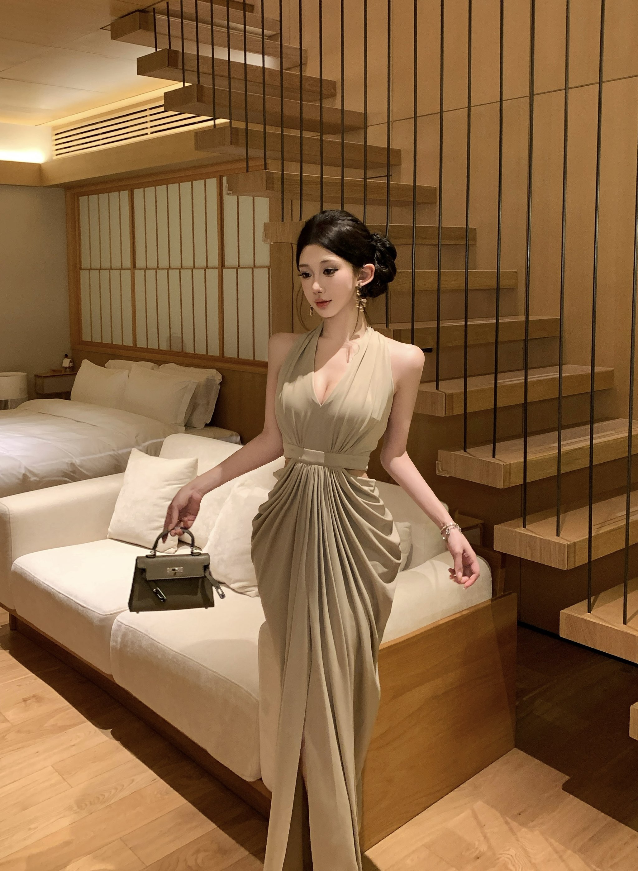 실사 정가 고급 센스 이슬 허리 주름 행침 목 V넥 몸매 가꾸기 트임 예복 롱 스커트