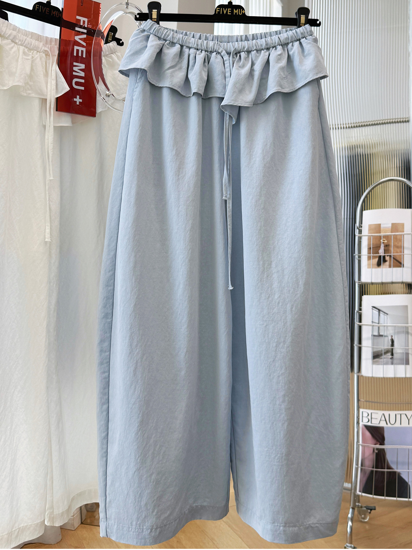 2026 새로운 한 부서 캐주얼 프릴 허리밴드 캐주얼 바지 여성 여름 얇은 스타일 모통이 칼 바지 9 포인트 와이드 레그 팬츠