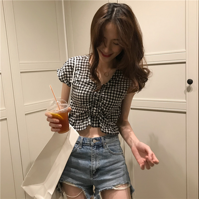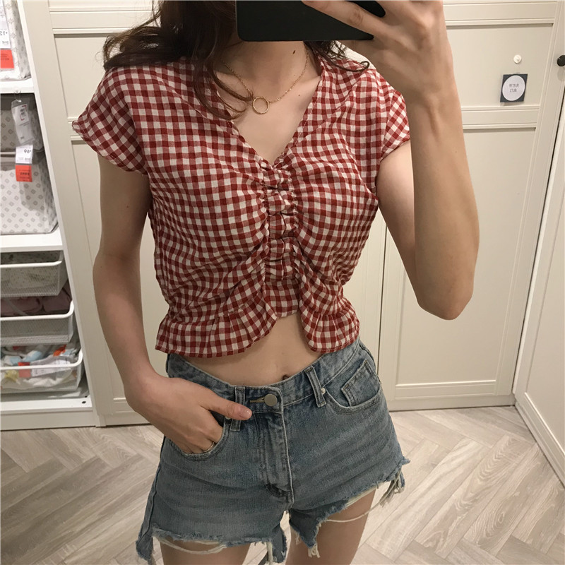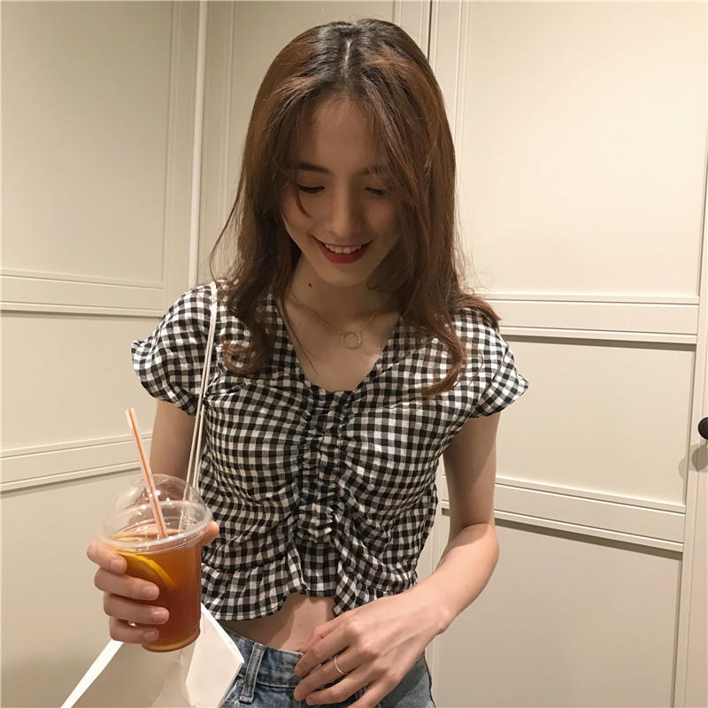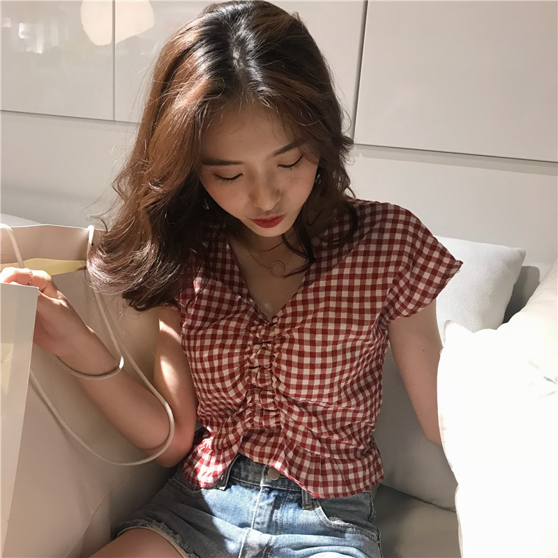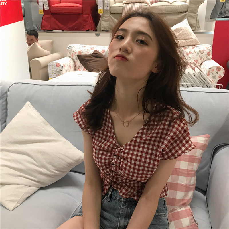 실사 정가 여름 드레스 새로운 작은 청신 V넥 배트윙 소매 격자 무늬 셔츠 여성 짧은 맨위