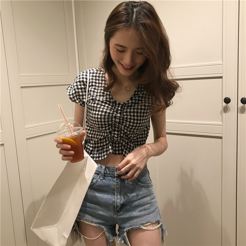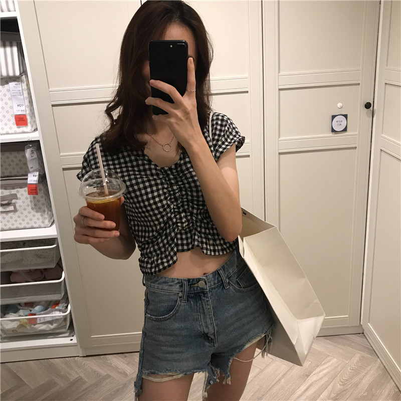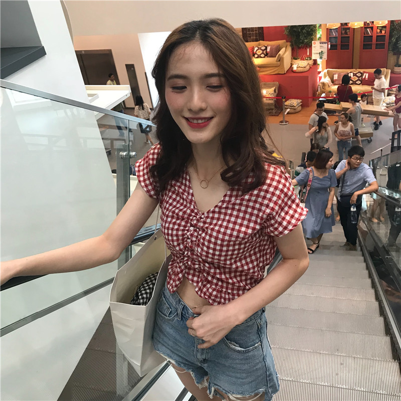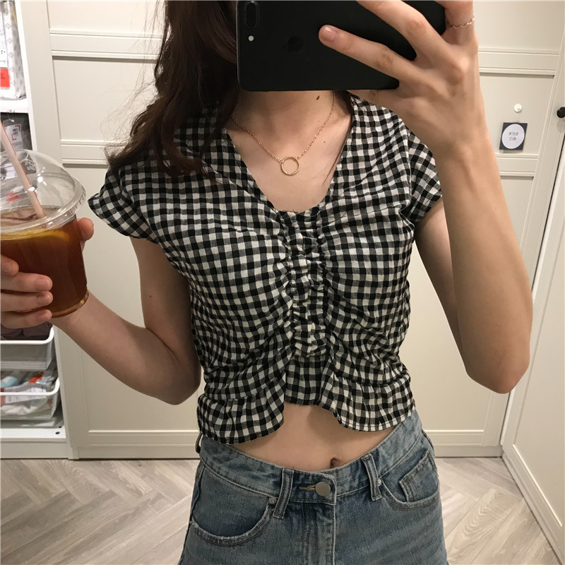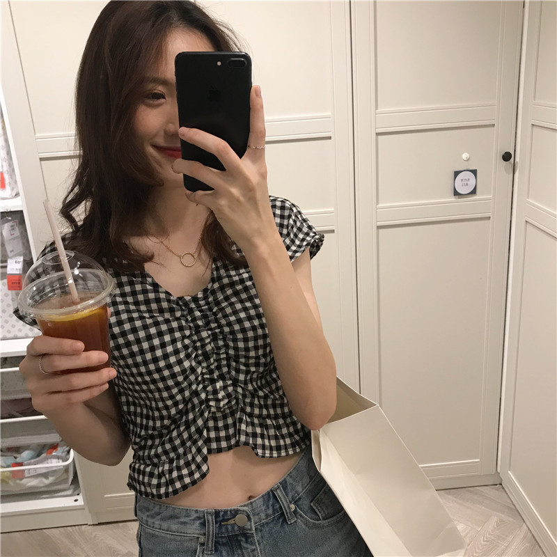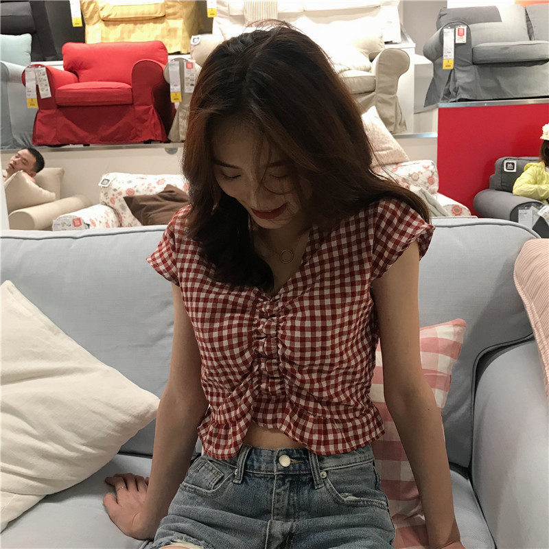 실사 정가 여름 드레스 새로운 작은 청신 V넥 배트윙 소매 격자 무늬 셔츠 여성 짧은 맨위