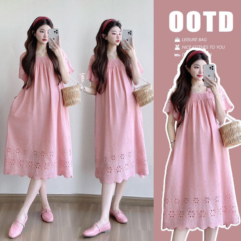 새로운 핑크색 광장 칼라 꽃 홀로우 아웃 임산부 드레스 루즈핏 슬림해 보이는 부드러운 바람을 피우다 롱 코트 드레스