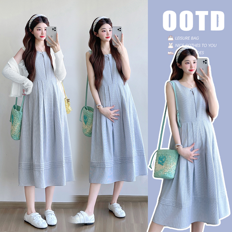 새로운 여름 스트라이프 민소매 조끼 스커트 니트 오픈 가디건 학원 스타일 루즈핏 작은 청신 임산부 드레스