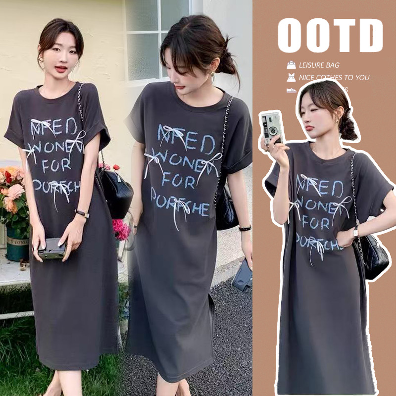 라운드 넥 프린트 T 수유 드레스 여름 루즈핏 슬림해 보이는 디자인 센스 나비 매듭 트임 드레스