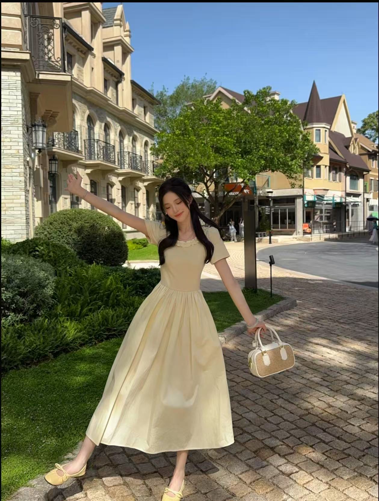 여름 새로운 프랑스식 거위 옐로우 홀로우 아웃 자수 V넥 수유 드레스 차 휴식 허리 수축 슬림해 보이는 롱 코트 A라인 스커트