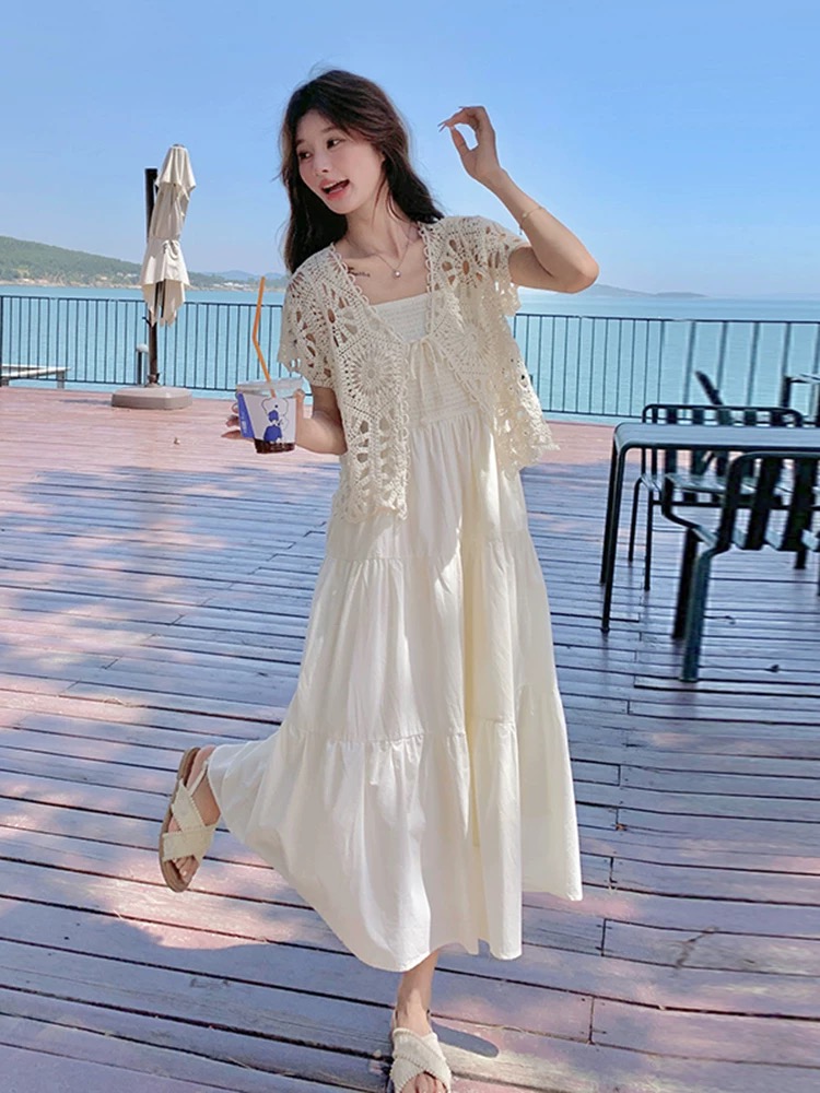 레이스 홀로우 아웃 오픈 가디건 슬립 수유 드레스 빛 럭셔리 고급 센스 휴가 해변 롱 스커트 투피스 슈트
