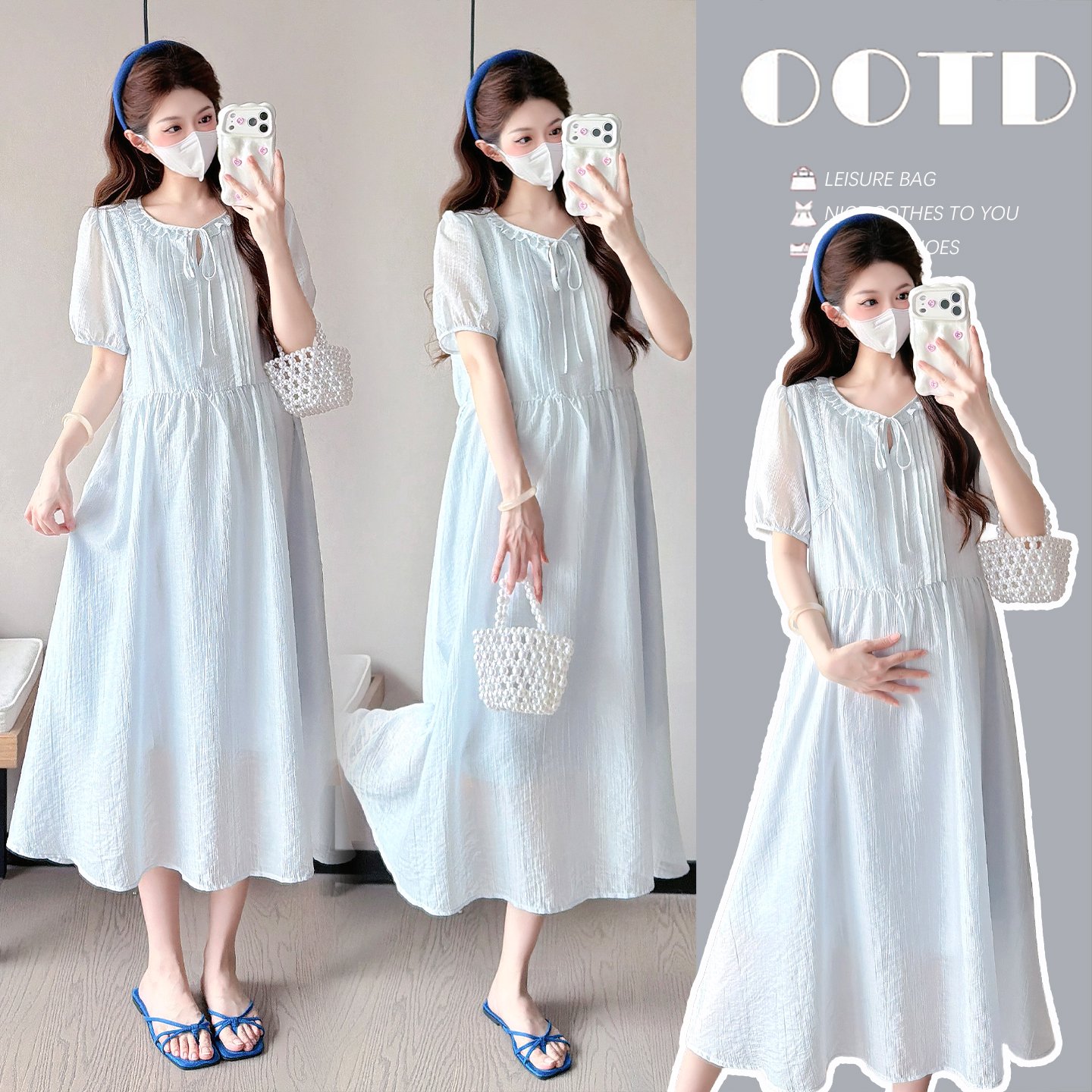 프랑스식 캄파넬라 세과 차 휴식 레트로 품격 허리 수축 슬림해 보이는 파란색 셔츠 수유 드레스