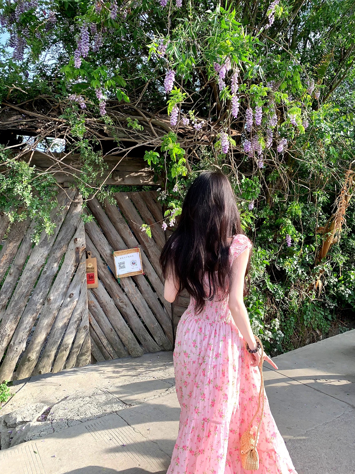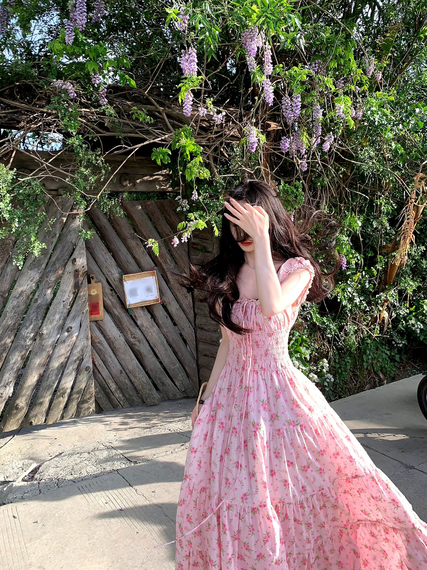 하나 달콤한 복숭아 yikett 모로코 정원 여름 꼬집기 허리 꽃무늬 여성 드레스 슬림해 보이는 원피스 치마