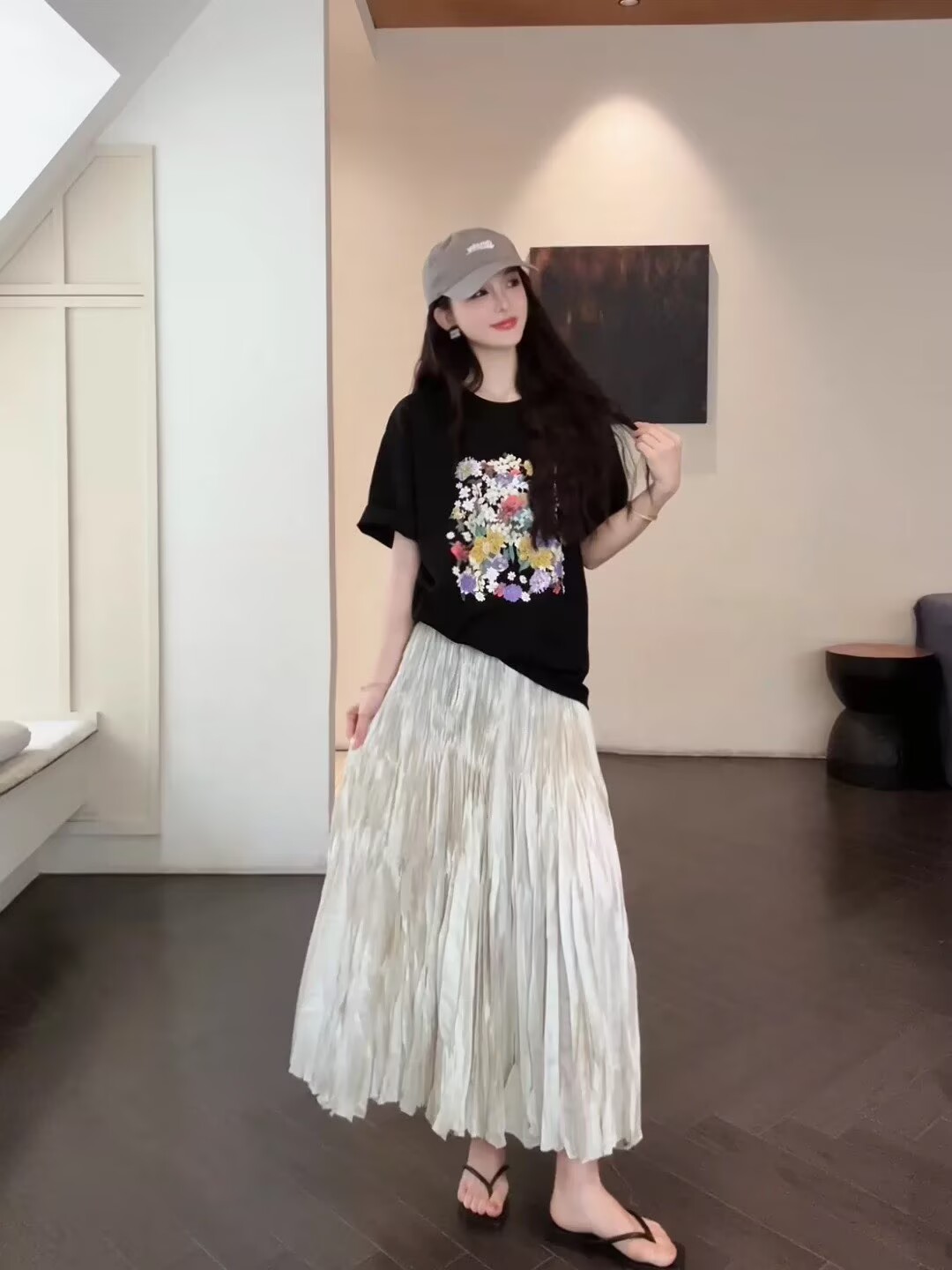 자이언트 잘 생긴 여름 착용 가져 가라. 세트 한 부서 느긋한 바람 루즈핏 프린트 반팔 티셔츠 주름 반신 스커트 투피스 세트