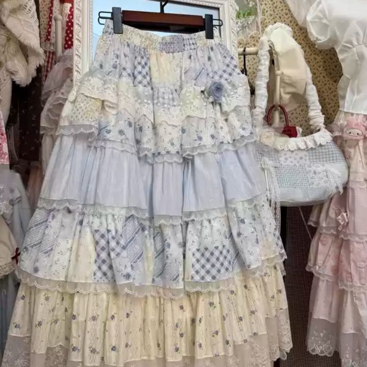 레트로 체크무늬 다중 레이어 배색 케이크 반신 스커트 여성 가을 새로운 디자인 센스 롱 스커트