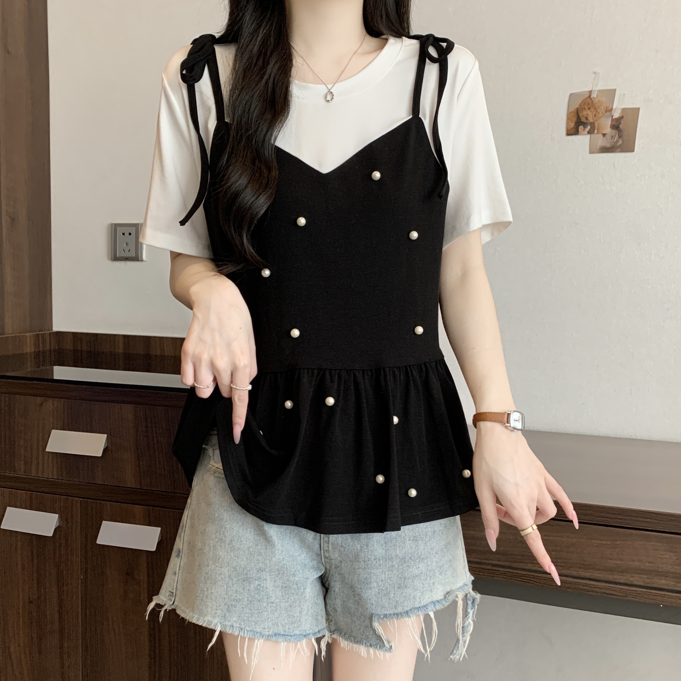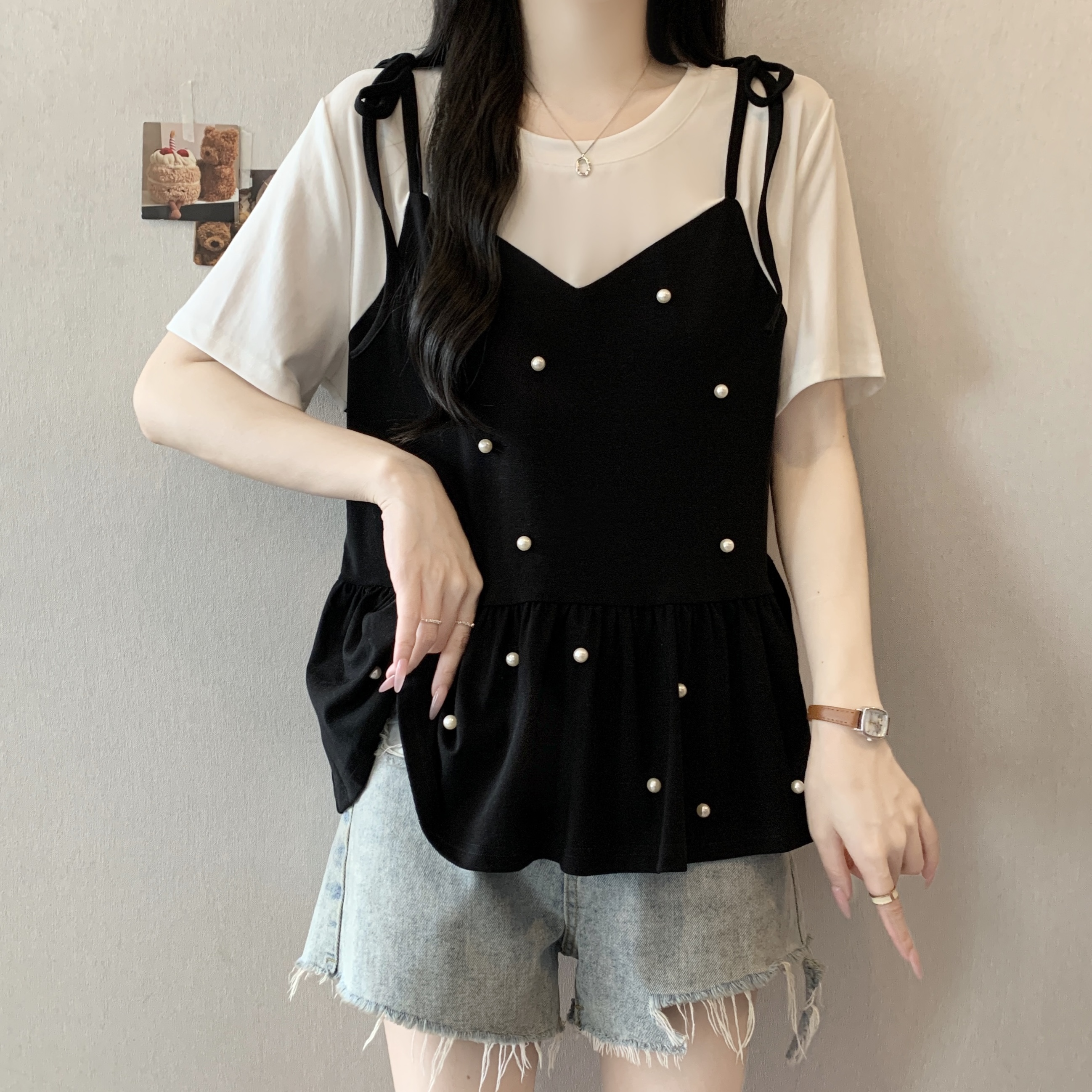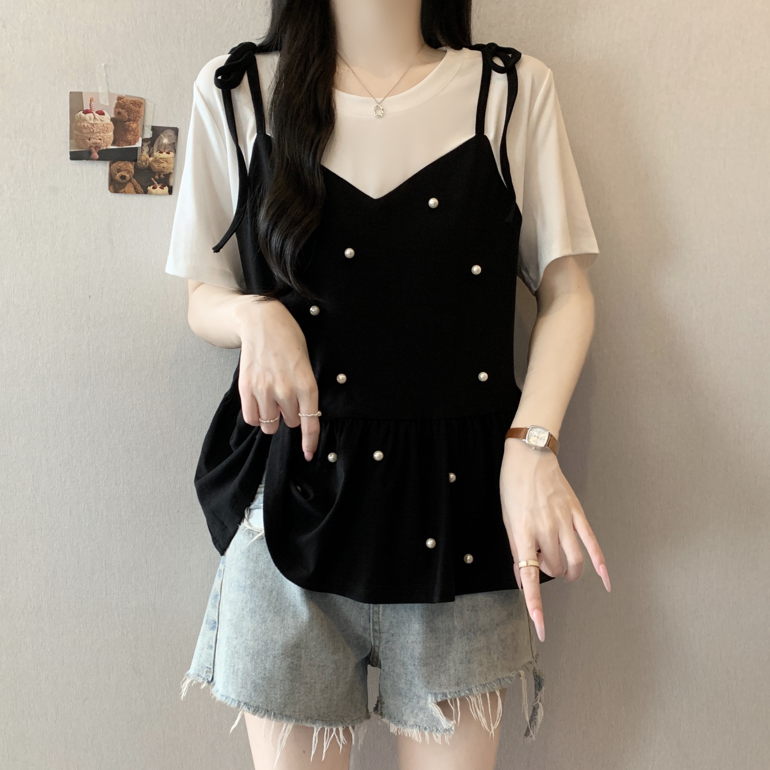 실사 2026 새로운 빅 사이즈 지방 mm 여름 섹션 디자인 센스 페이크 레이어드 비즈 박기 연령 감소 표지 배 슬림해 보이는 다용도 맨위