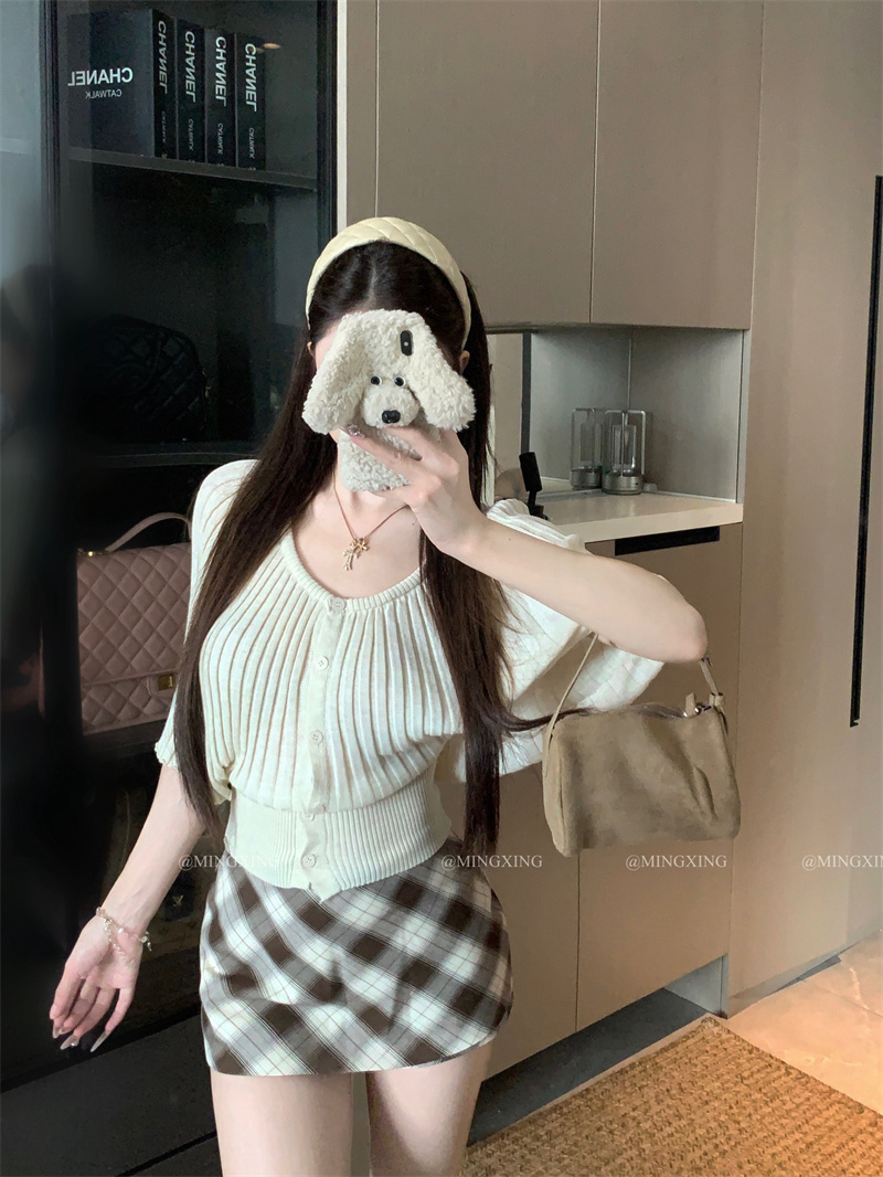 실사 정가 프랑스식 부드러운 바람 허리 수축 니트 반팔 티셔츠 여성 여름 새로운 허리 수축 슬림해 보이는 맨위