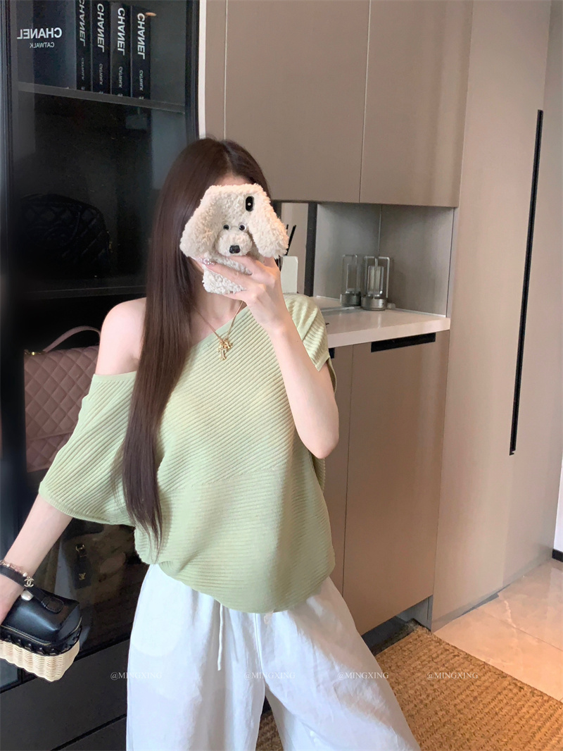 실사 정가 26 년 여름 새로운 비스듬한 칼라 배트윙 소매 둘 착용 슬림해 보이는 니트 작은 셔츠