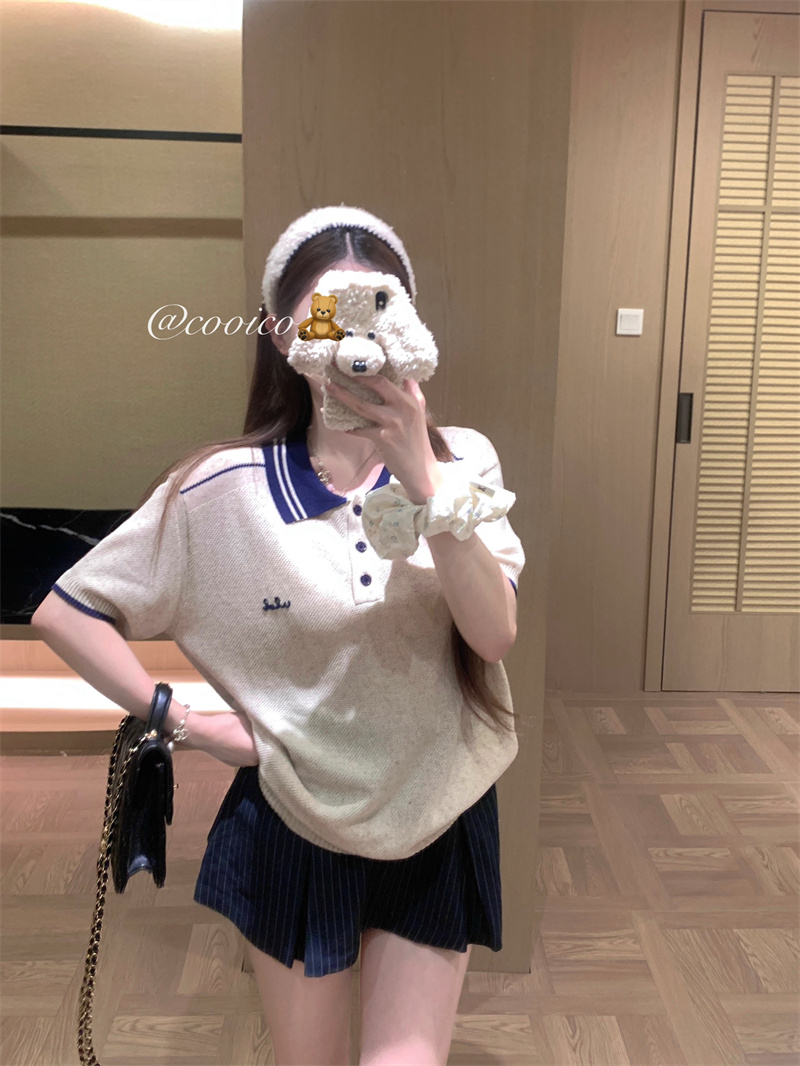 실사 정가 동백 나무 여름 새로운 파란색 라운드 넥 몸매 가꾸기 니트 스웨터 반팔 티셔츠 여성 셔츠