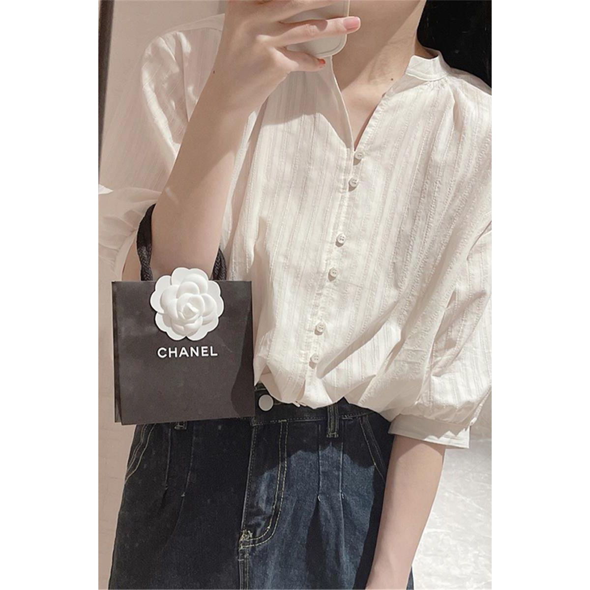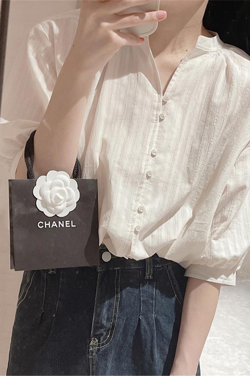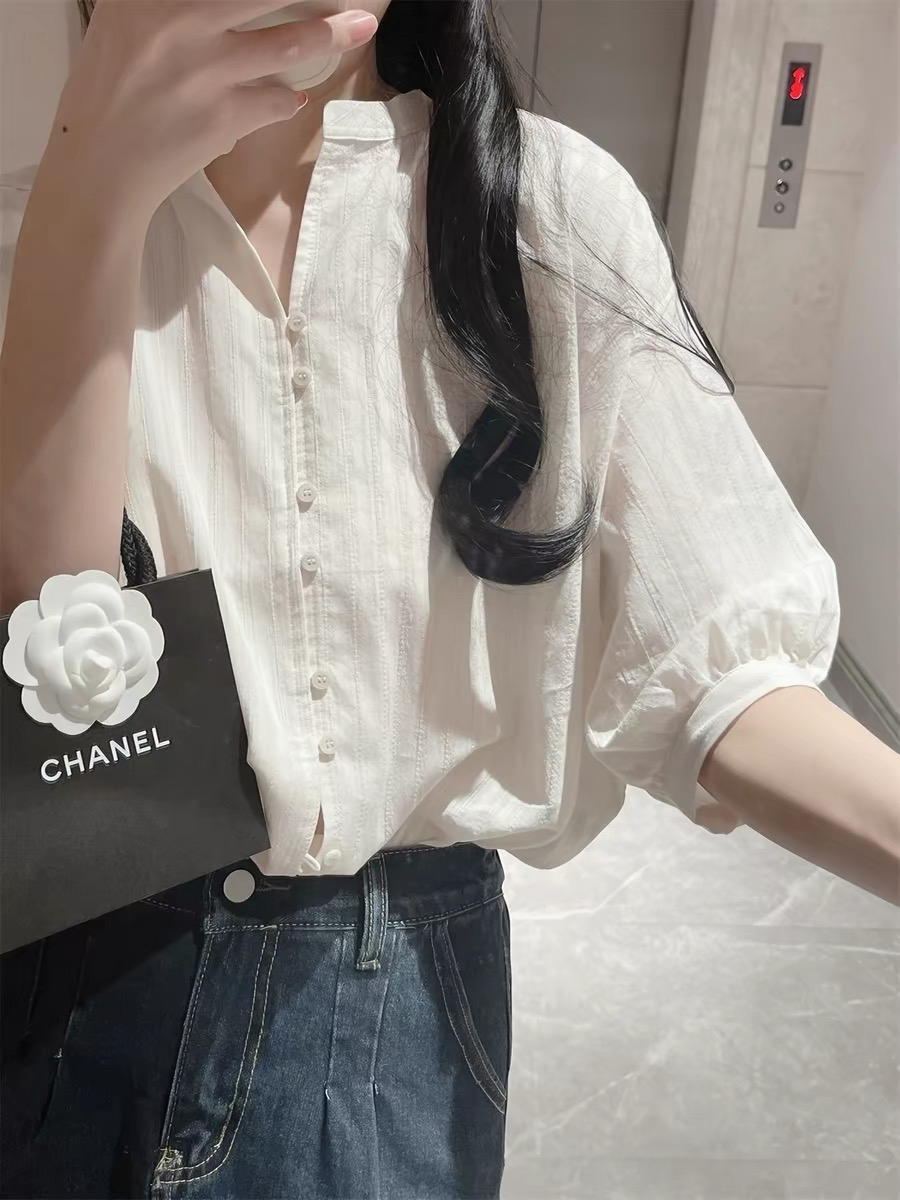 프랑스식 화이트 면 린넨 여성 셔츠 여름 얇은 스타일 아마 거품 소매 셔츠 품격 중간 소매 5 점 소매 맨위