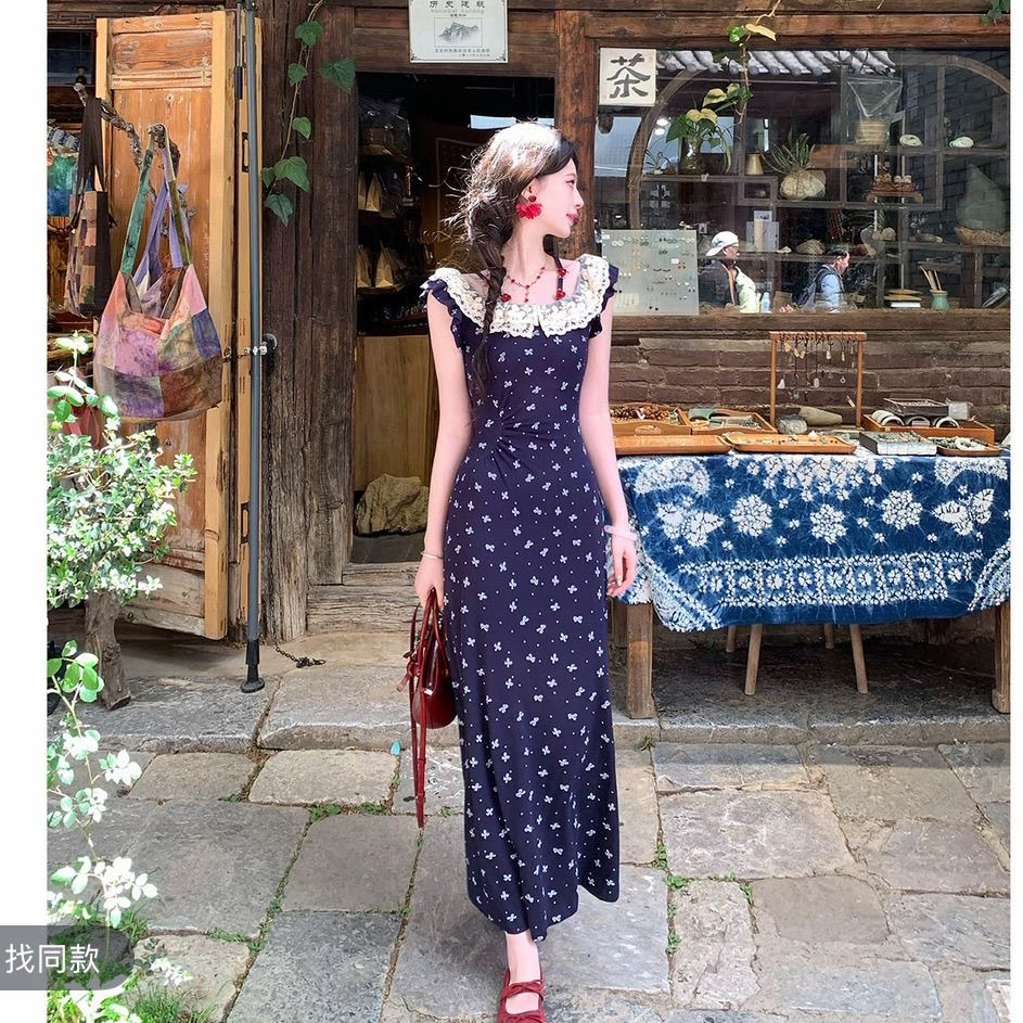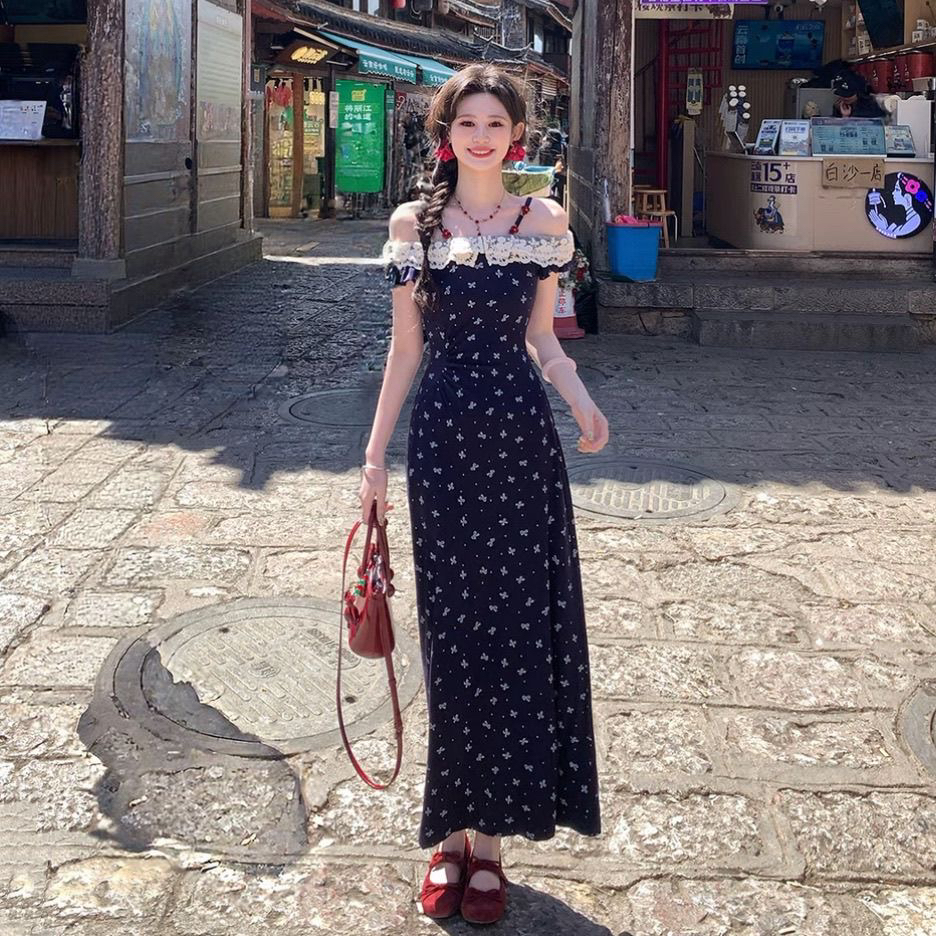 여름 스타일 프랑스식 디자인 센스 연령 감소 프릴 보트넥 니트 꽃무늬 드레스 꽃무늬 길다 치마