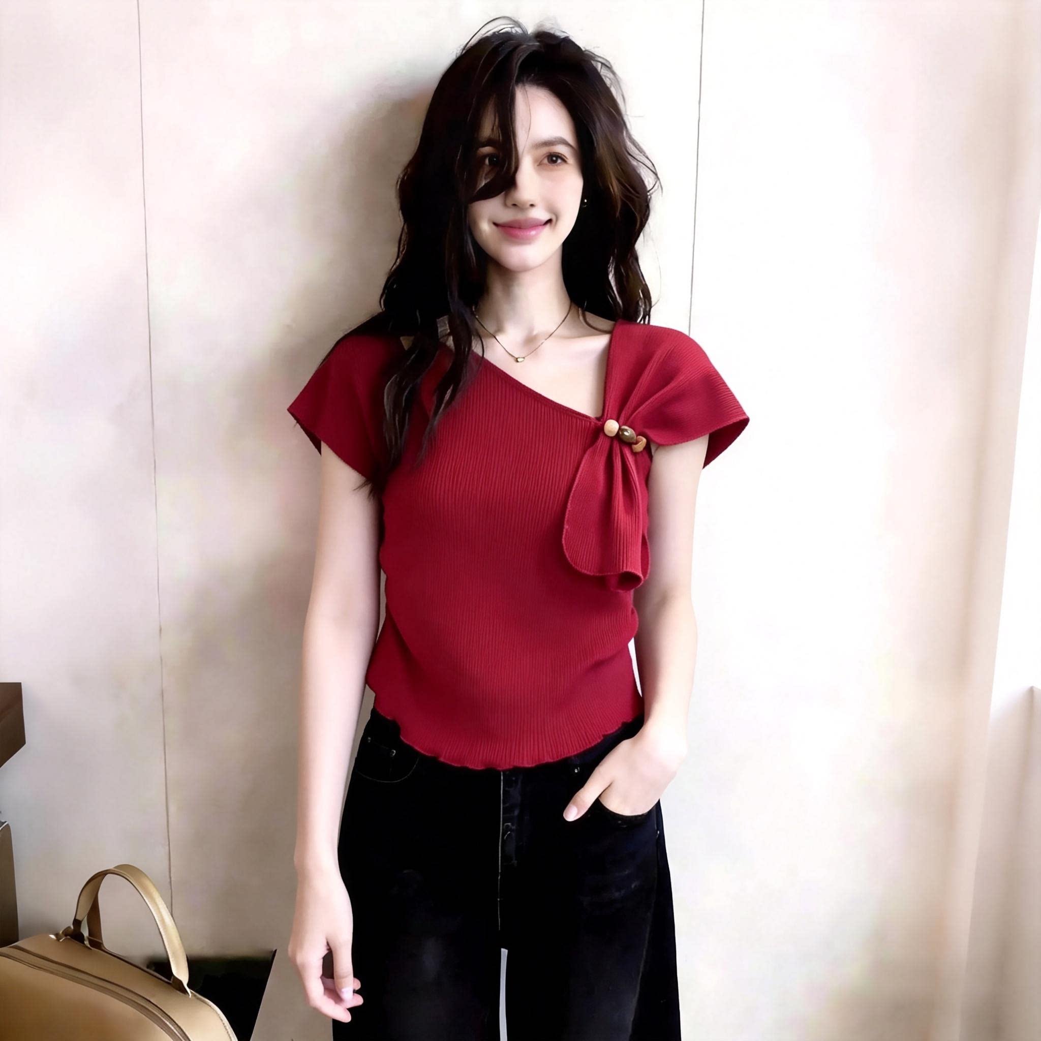 프랑스식 핫걸 Chic 빨간색 쇼트 스타일 맨위 여성 2025 년 여름 새로운 반팔 티셔츠 디자인 센스 작은 대중