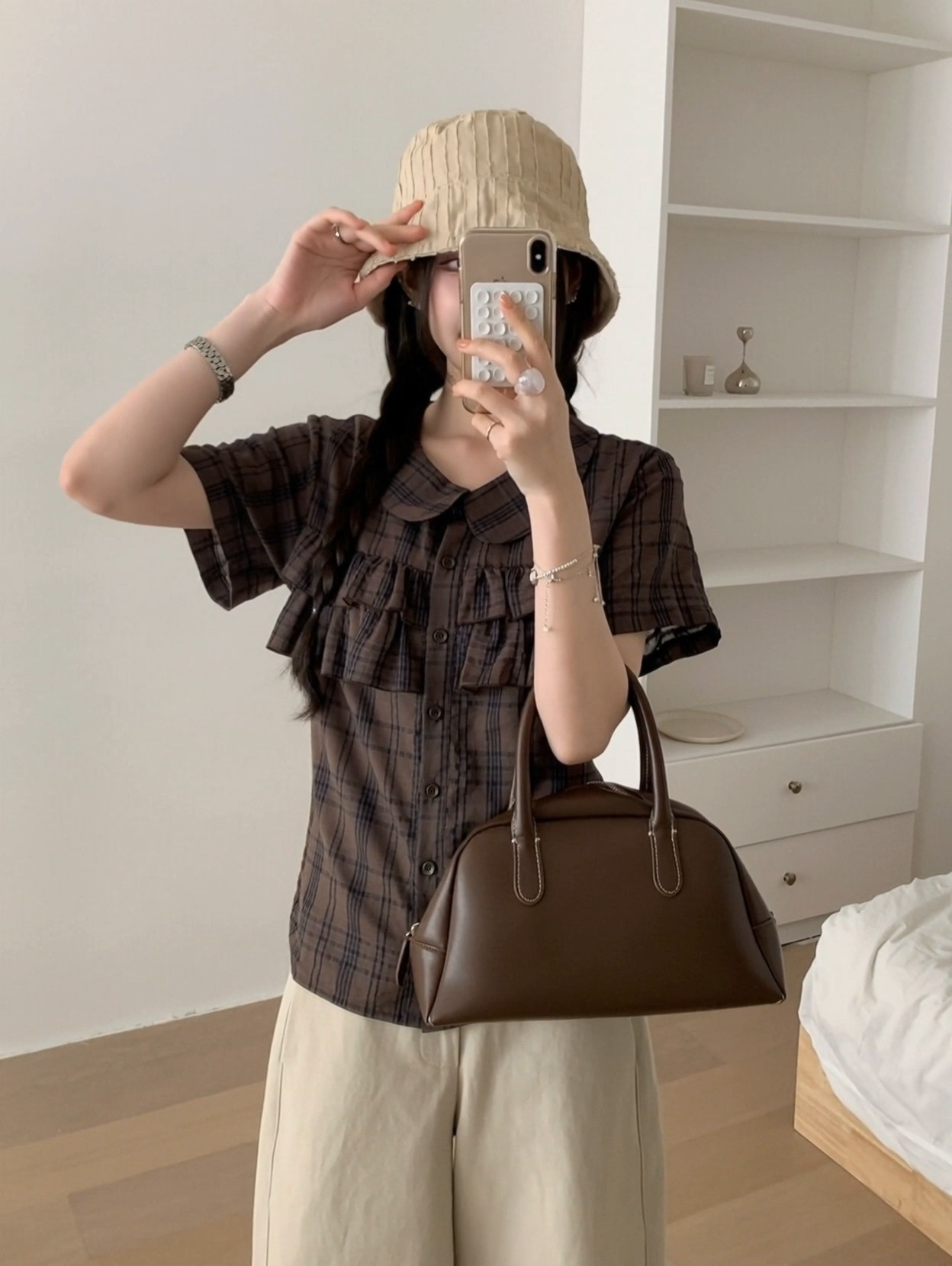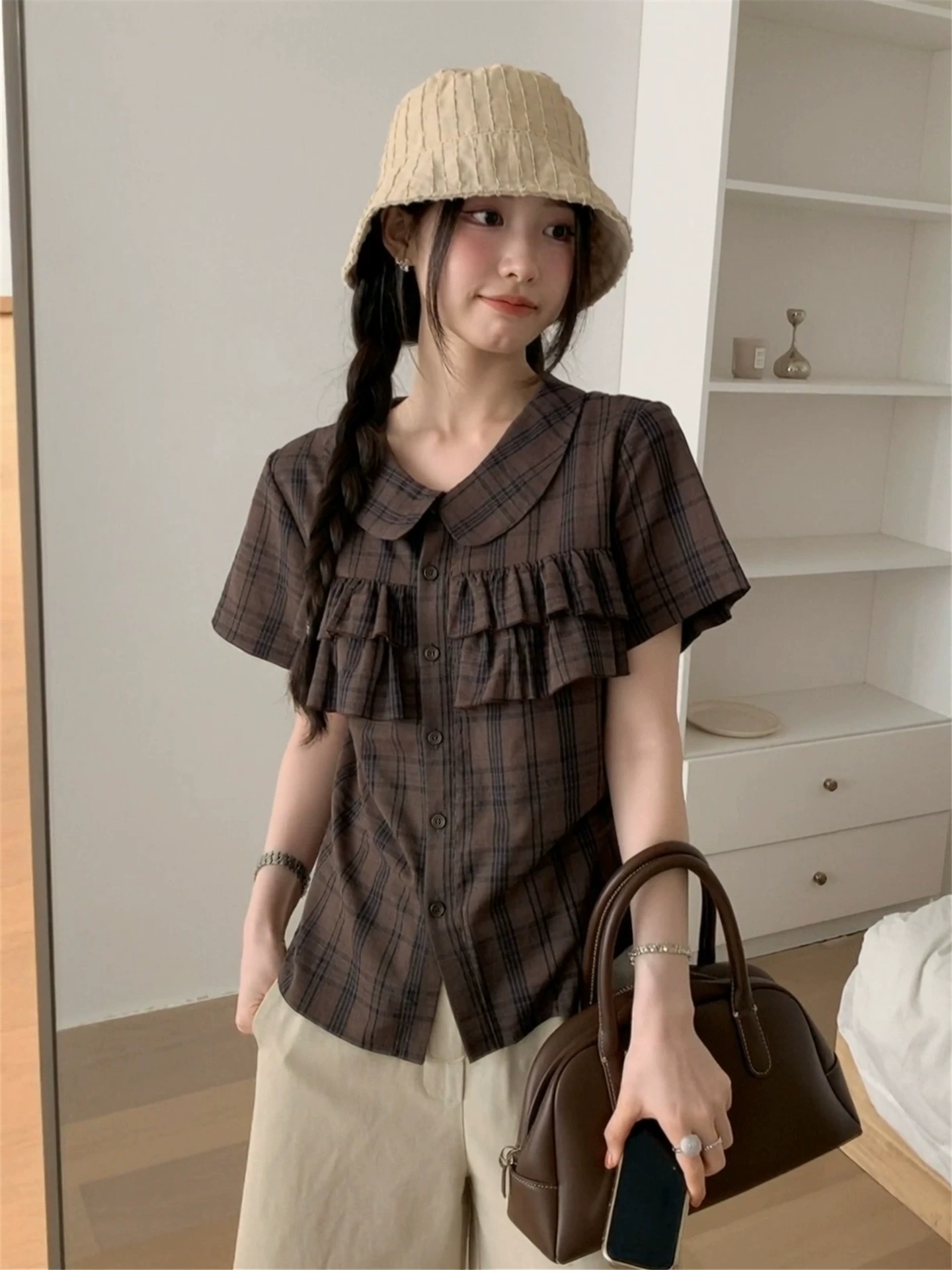 한 부서 레트로 학원 스타일 체크무늬 폴로 칼라 맨위 여성 2026 년 여름 새로운 반팔 작은 셔츠 디자인 센스 작은 대중