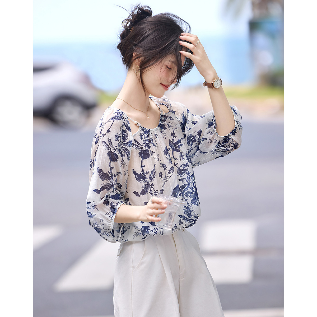 새로운 중식 청화 백자 우아함 느긋한 바람 꽃무늬 26 년 아모이 느슨함 센스 레이스업 슬림해 보이는 셔츠