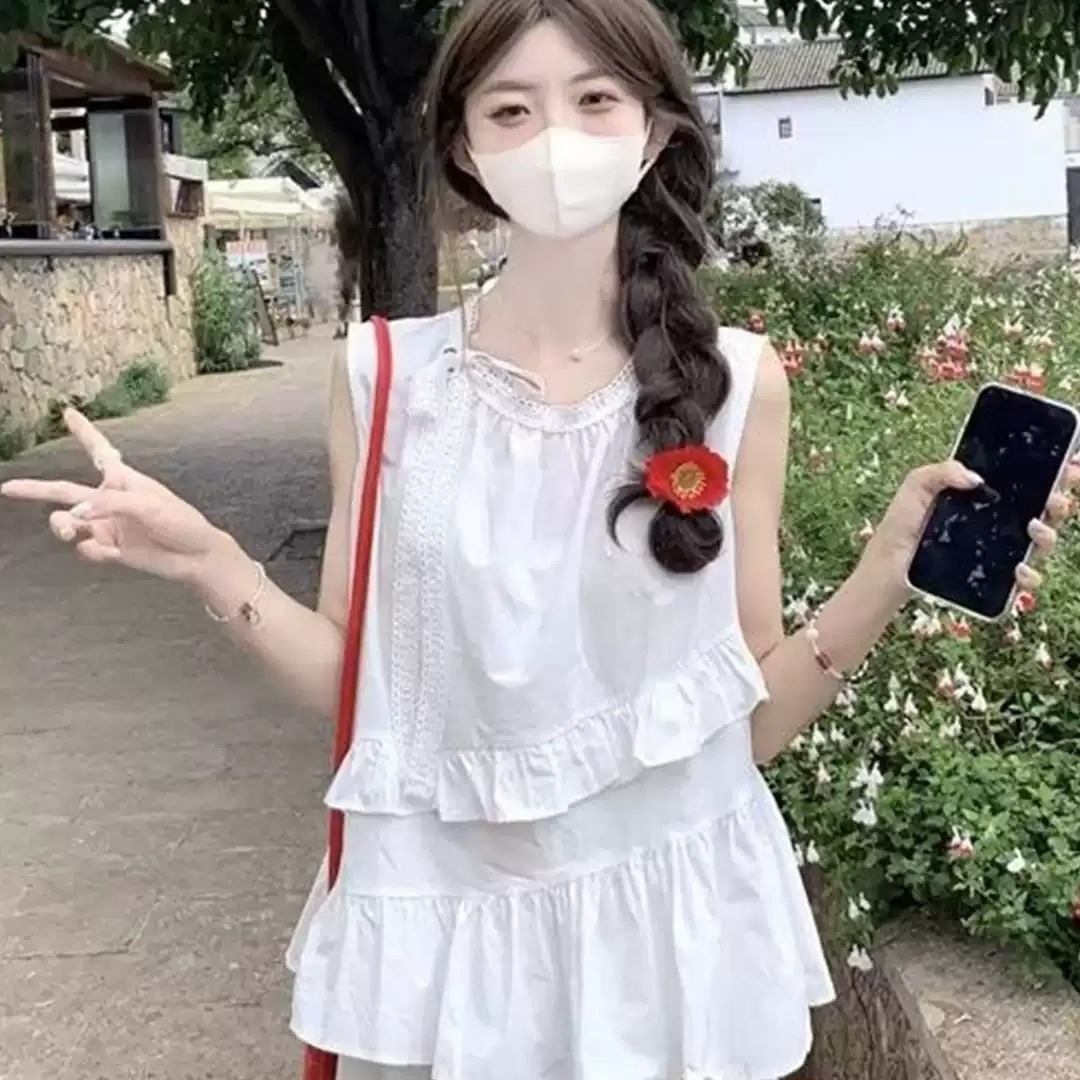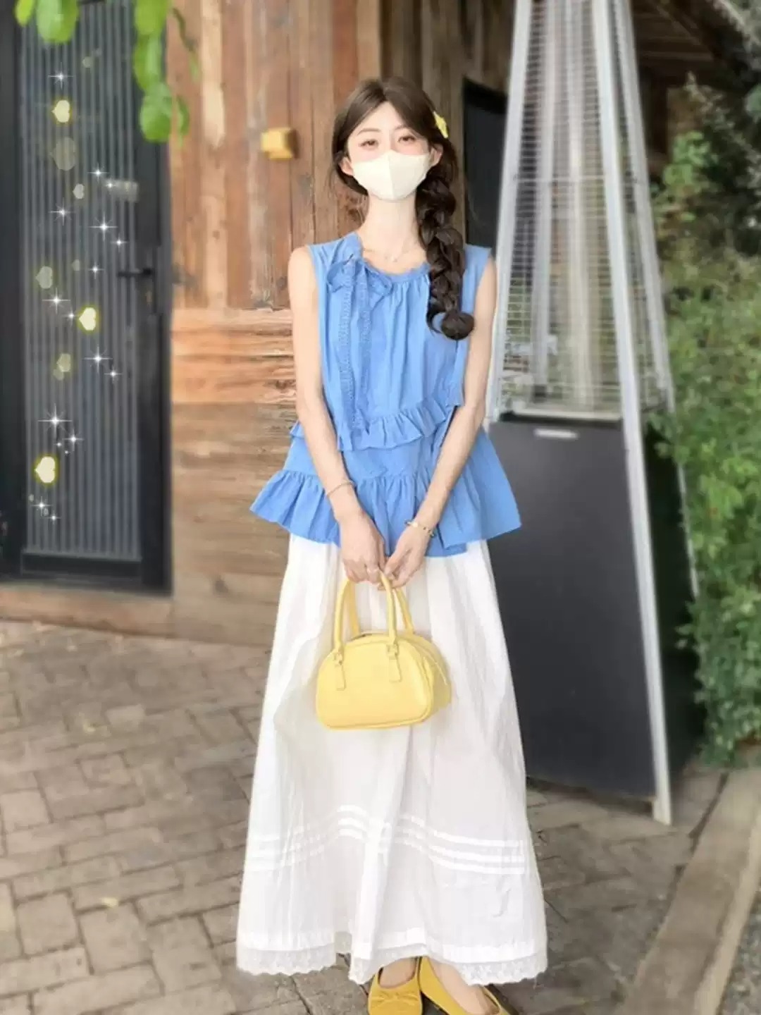 프랑스식 사소한 슈퍼 잘 생긴 고유 한 아름다운 파란색 셔츠 나비 매듭 맨위 민소매 조끼 여성 여름 외출용 상쾌