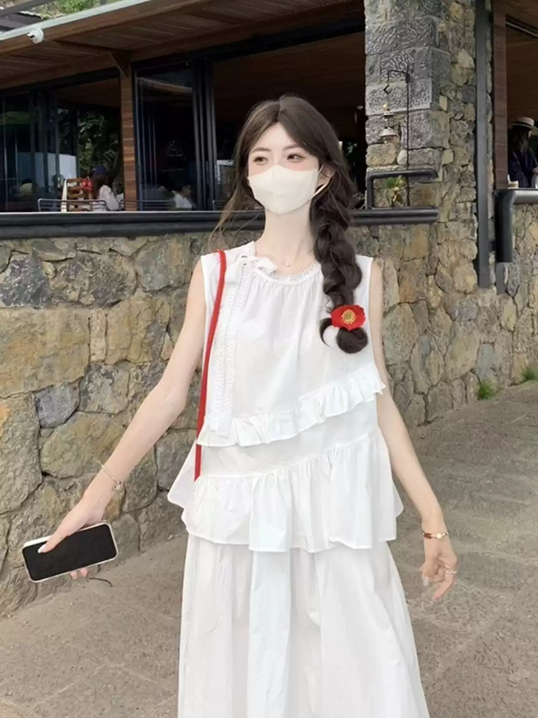 여름 새로운 민소매 맨위 세트 여성 2026 새로운 디자인 센스 작은 셔츠 캐주얼 루즈핏 반신 스커트 두 조각 여성 세트