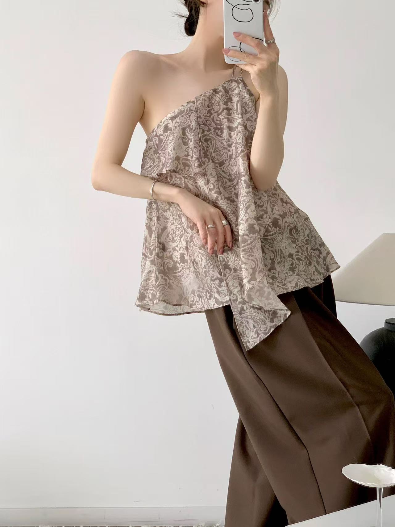 신제품 고전 캐슈 꽃 프릴 비스듬한 襟 불규칙 숄더백 슬립 외출용 여성 여름 휴가 바람 맨위