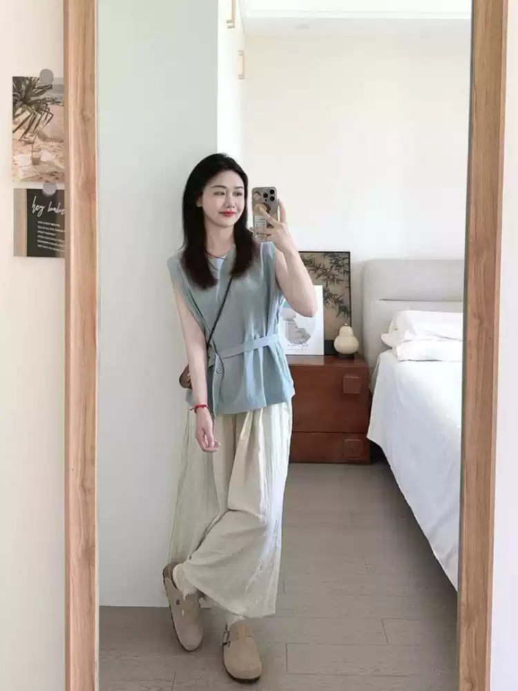 자이언트 잘 생긴 ootd 착용 가져 가라. 전체 집합 2026 새로운 녹색 민소매 조끼 맨위 여성 여름 와이드 레그 팬츠 세트