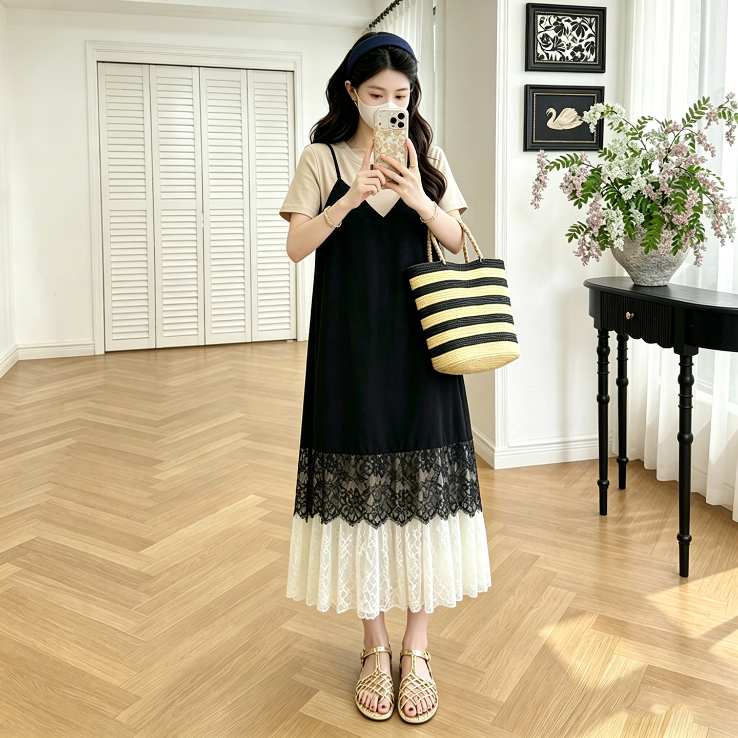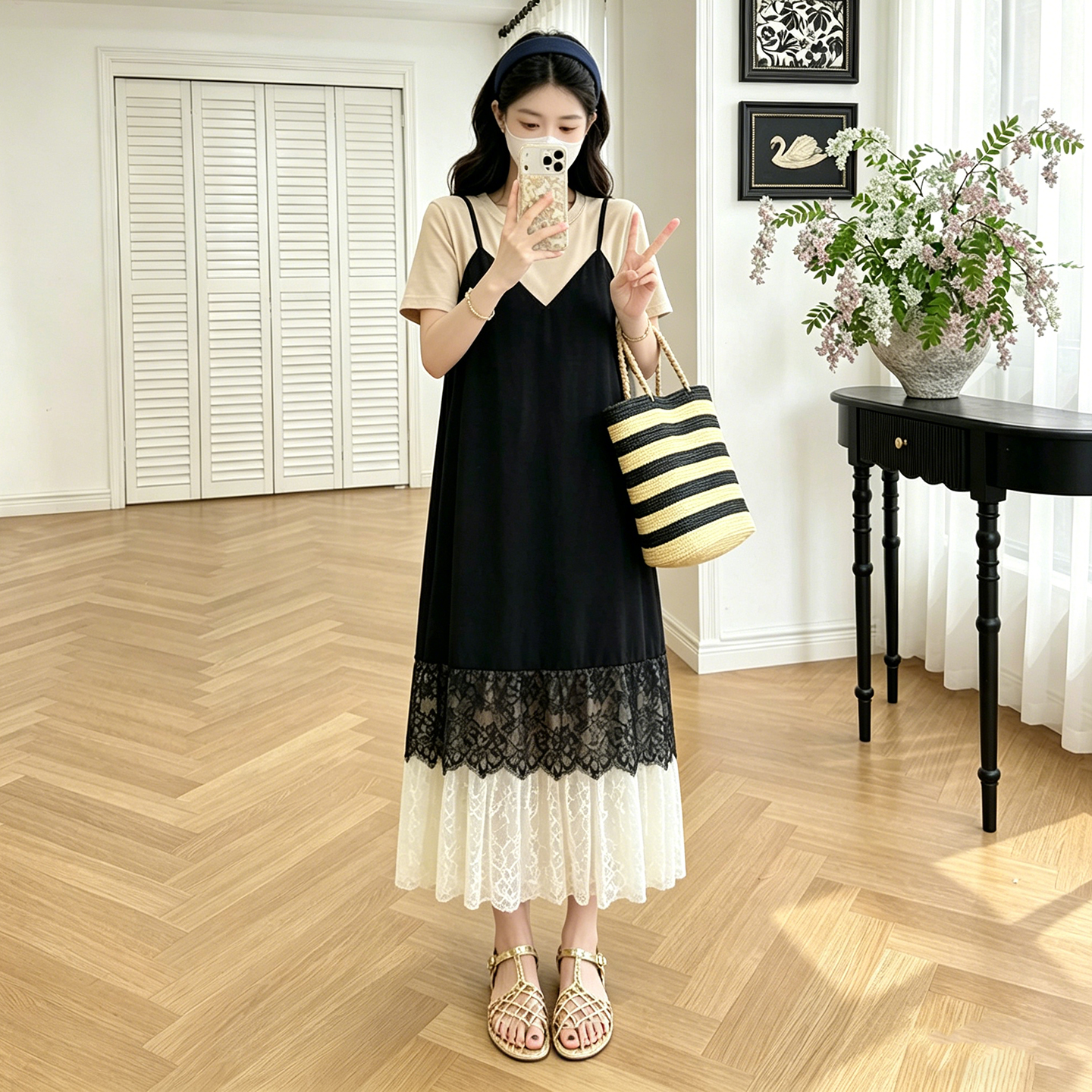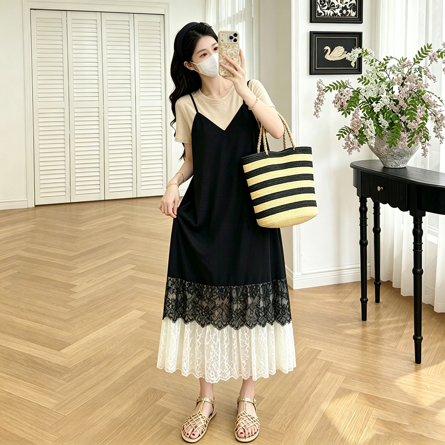 실사 임산부 레이스 조각 페이크 레이어드 프랑스식 배색 슬림해 보이는 드레스