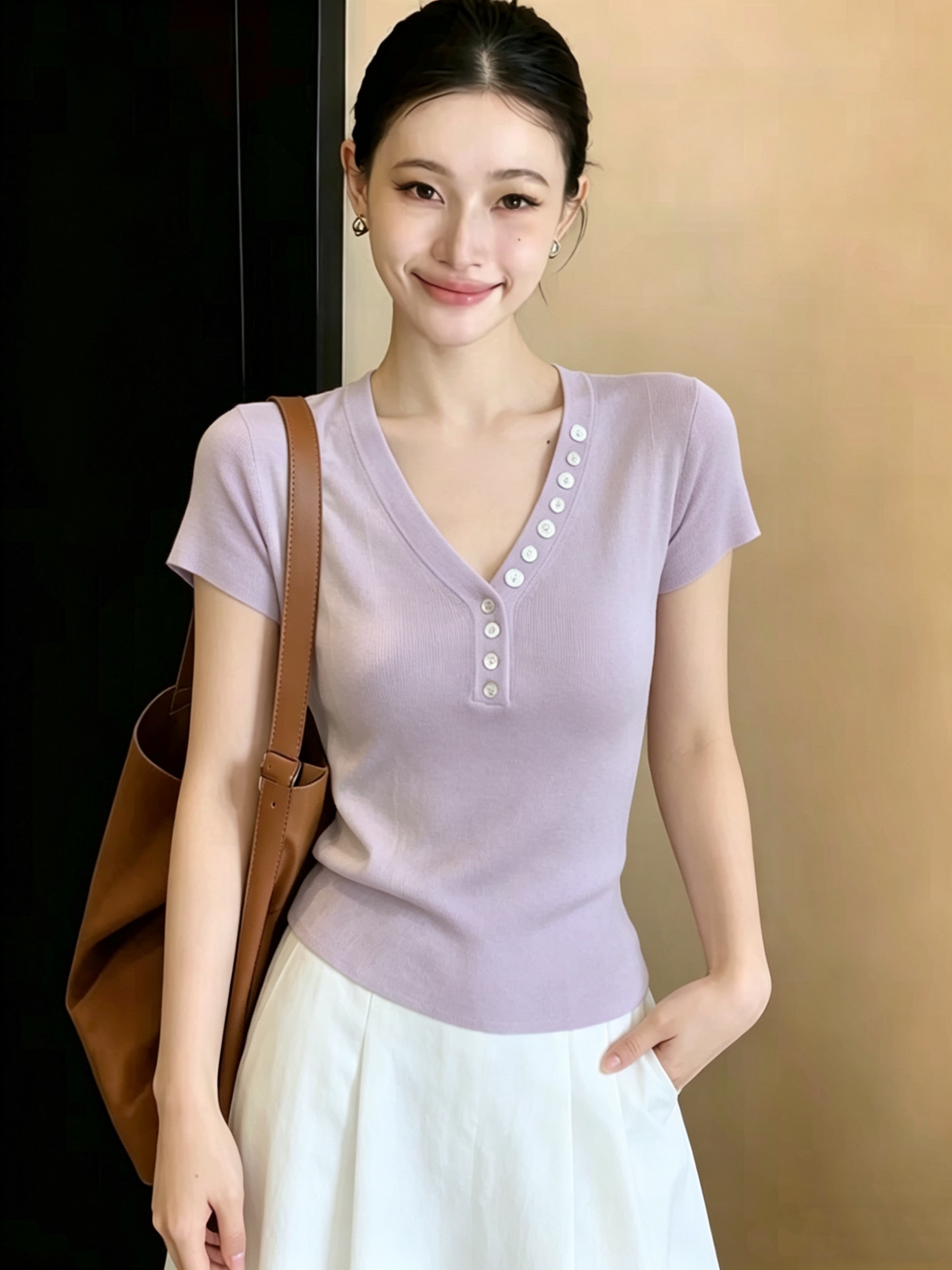 재고 있음 2026 여름 새로운 품격 프랑스식 V넥 홀로우 아웃 반팔 얼음 실크 니트 스웨터 허리 수축 맨위