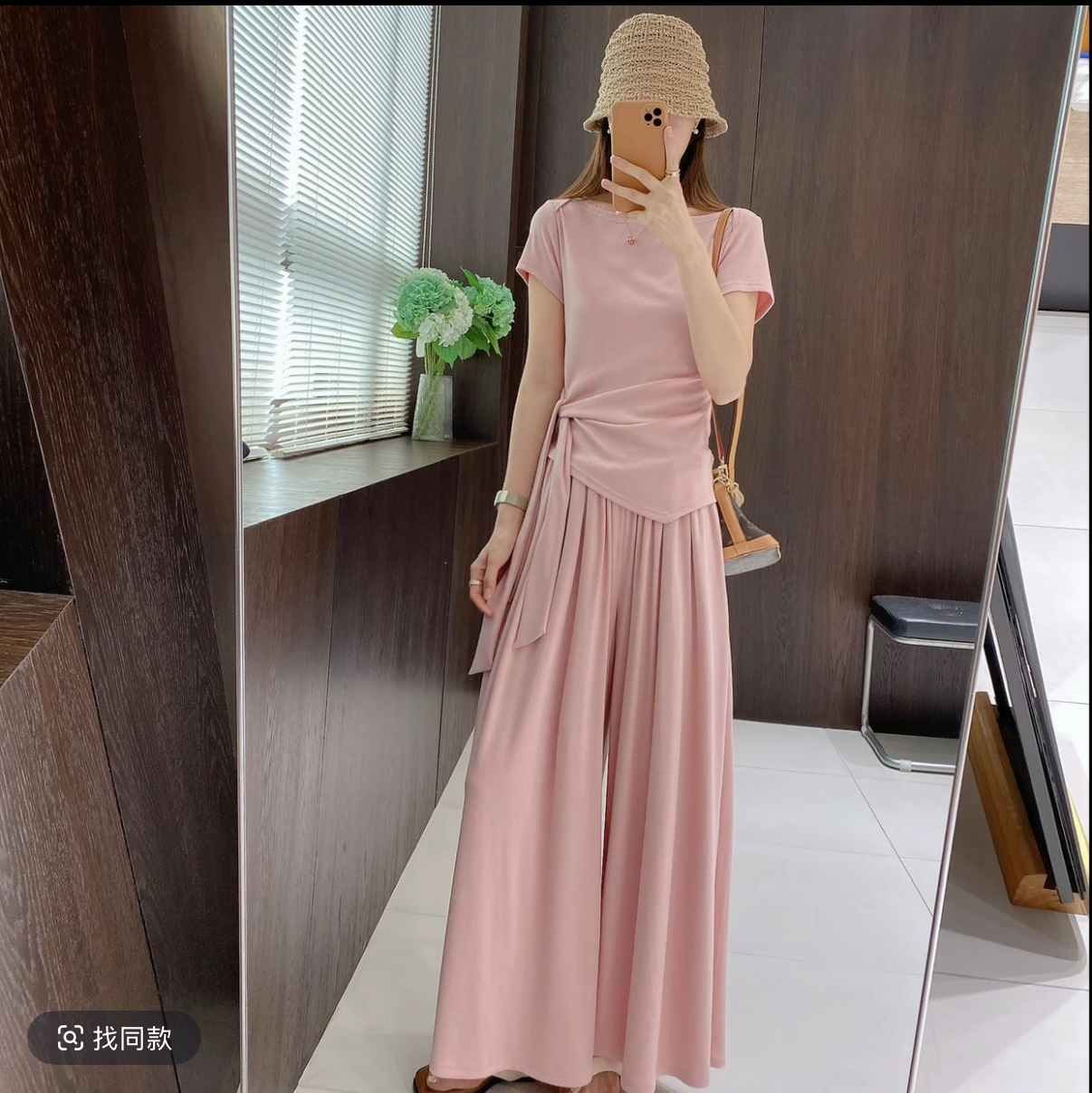 여름 새로운 어머니 드레스 중년 여성 투피스 세트 패션 다용도 반팔 와이드 레그 팬츠 슬림해 보이는 세트