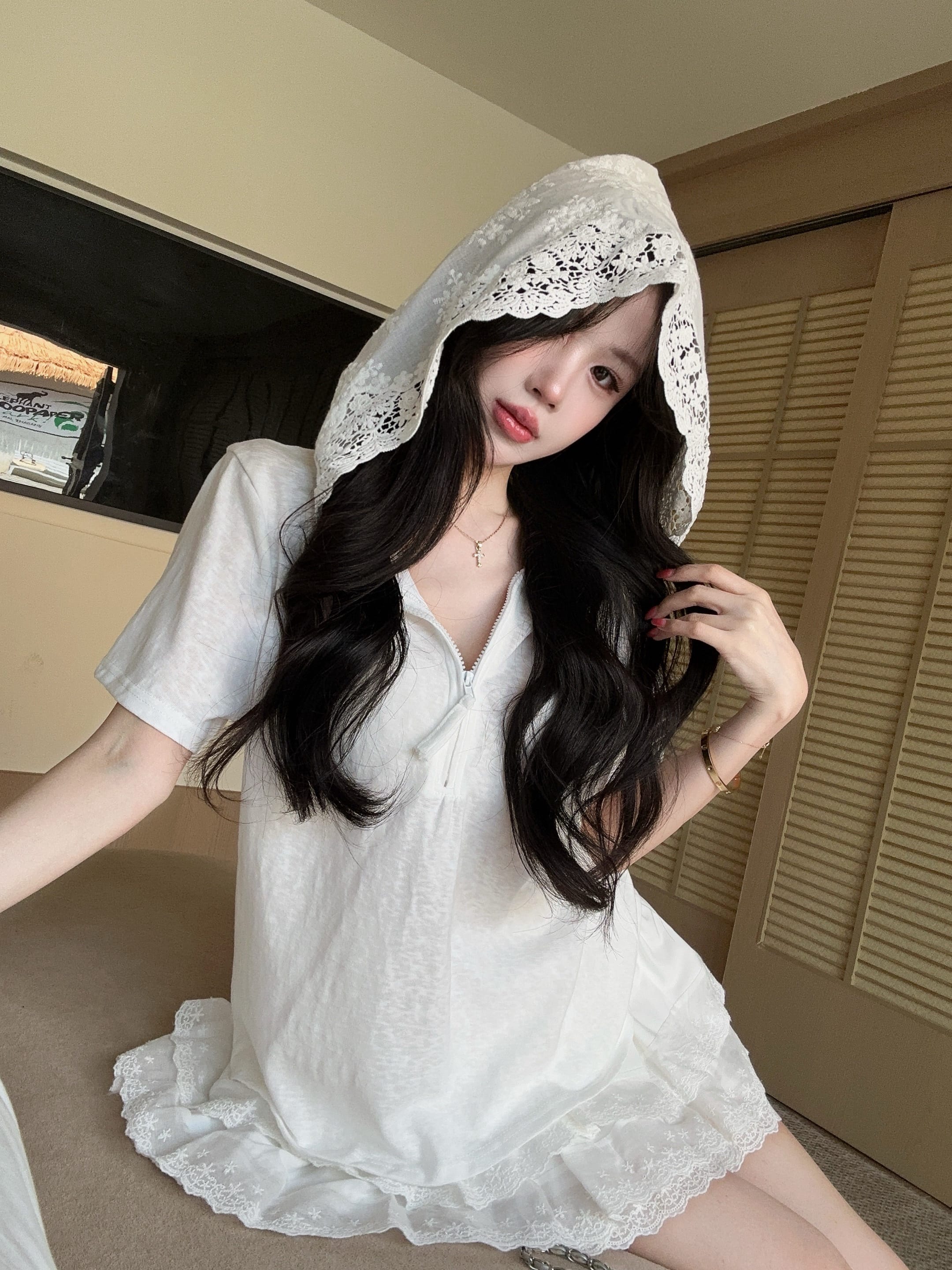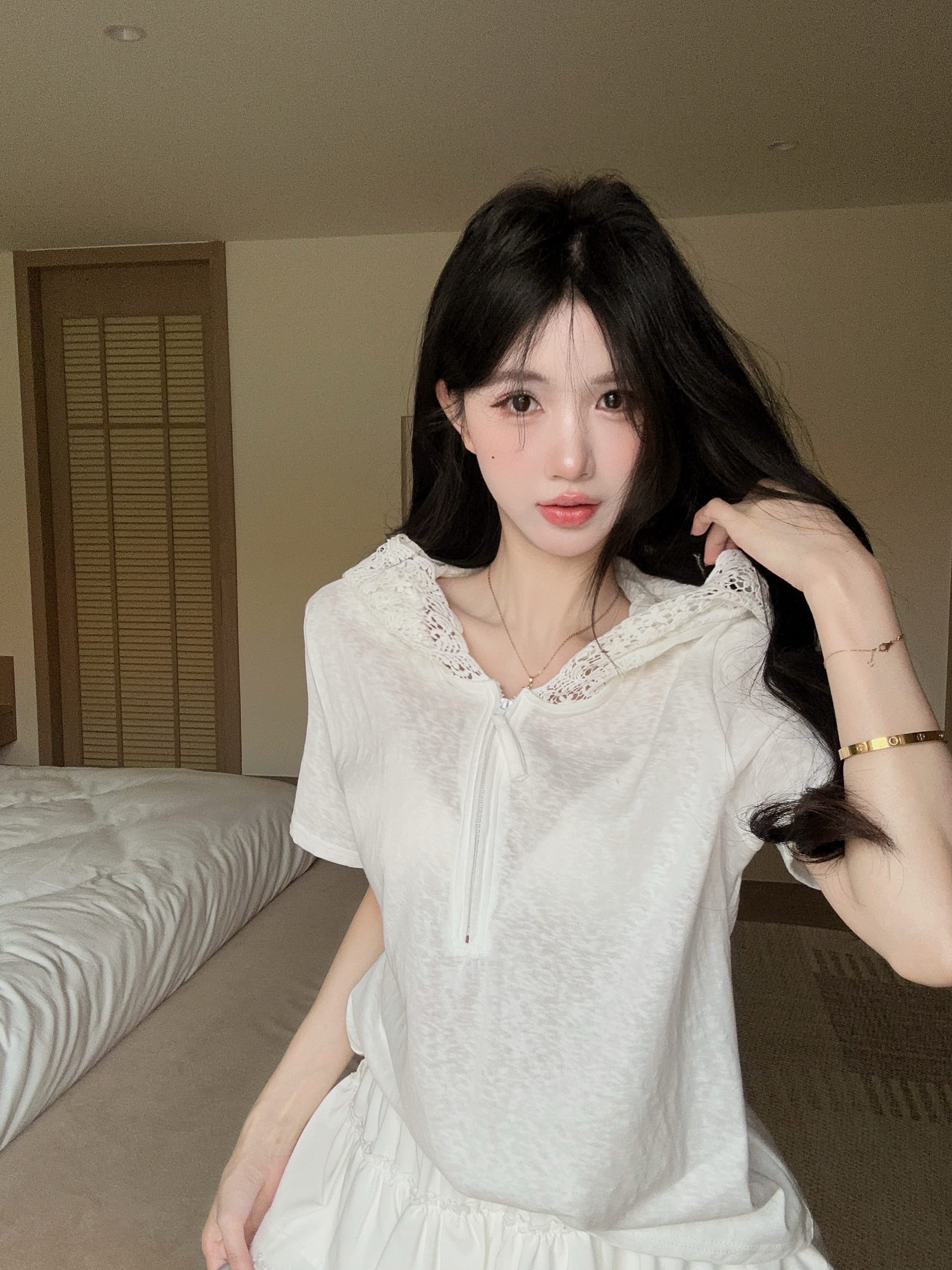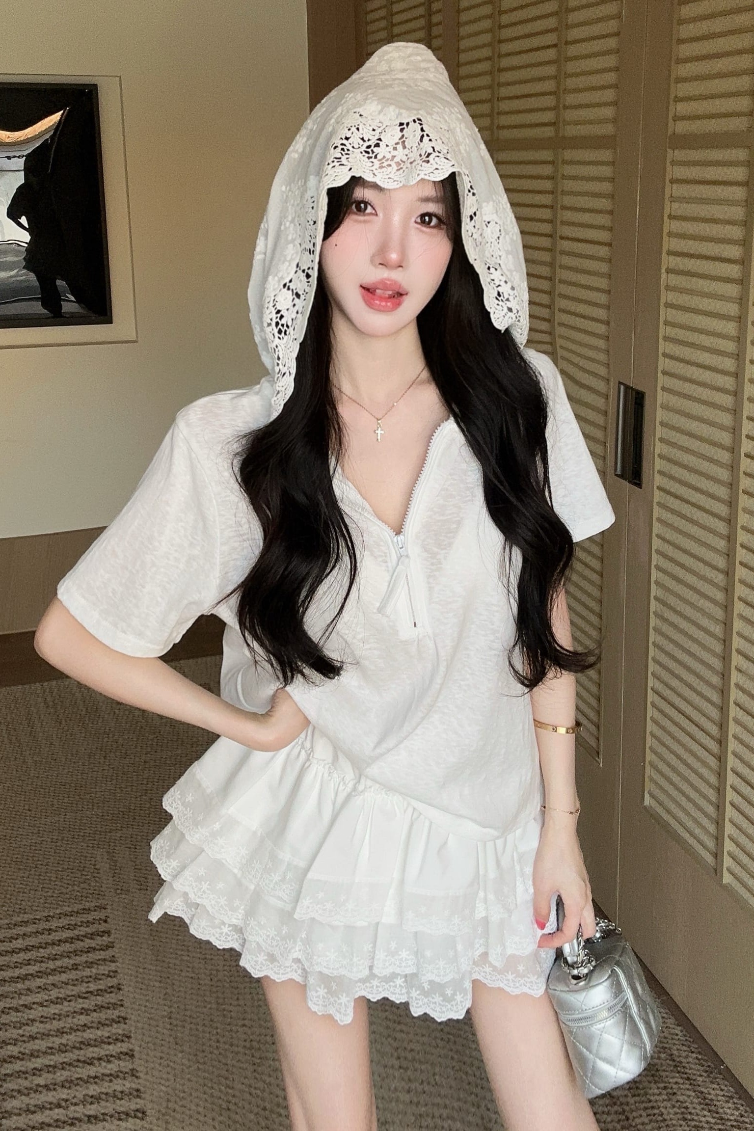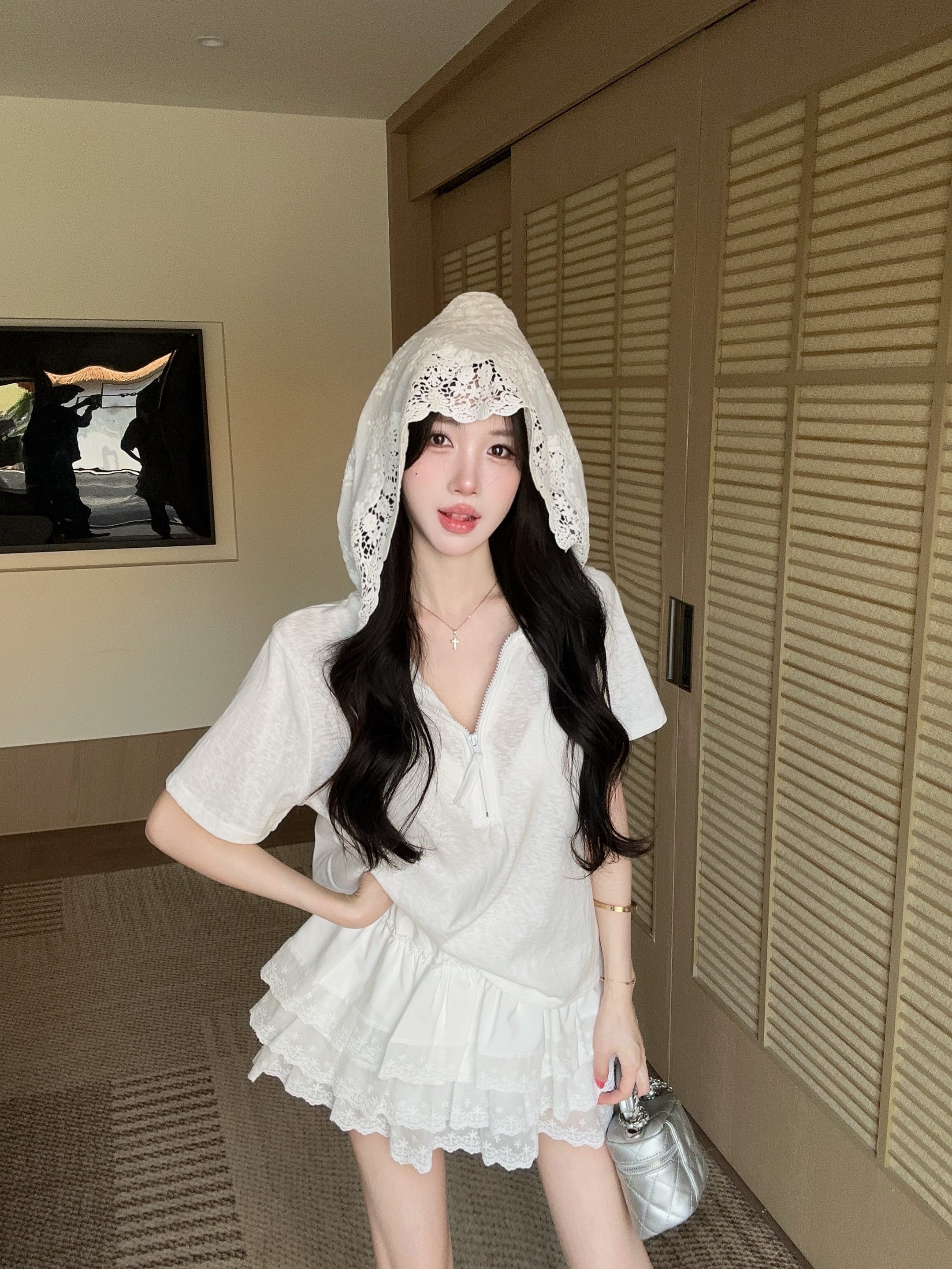 실사 정가 여름 레이스 측면 반팔 대나무 마디 면 후드 티셔츠 레이스 레이스 치마 미니 스커트 투피스 슈트