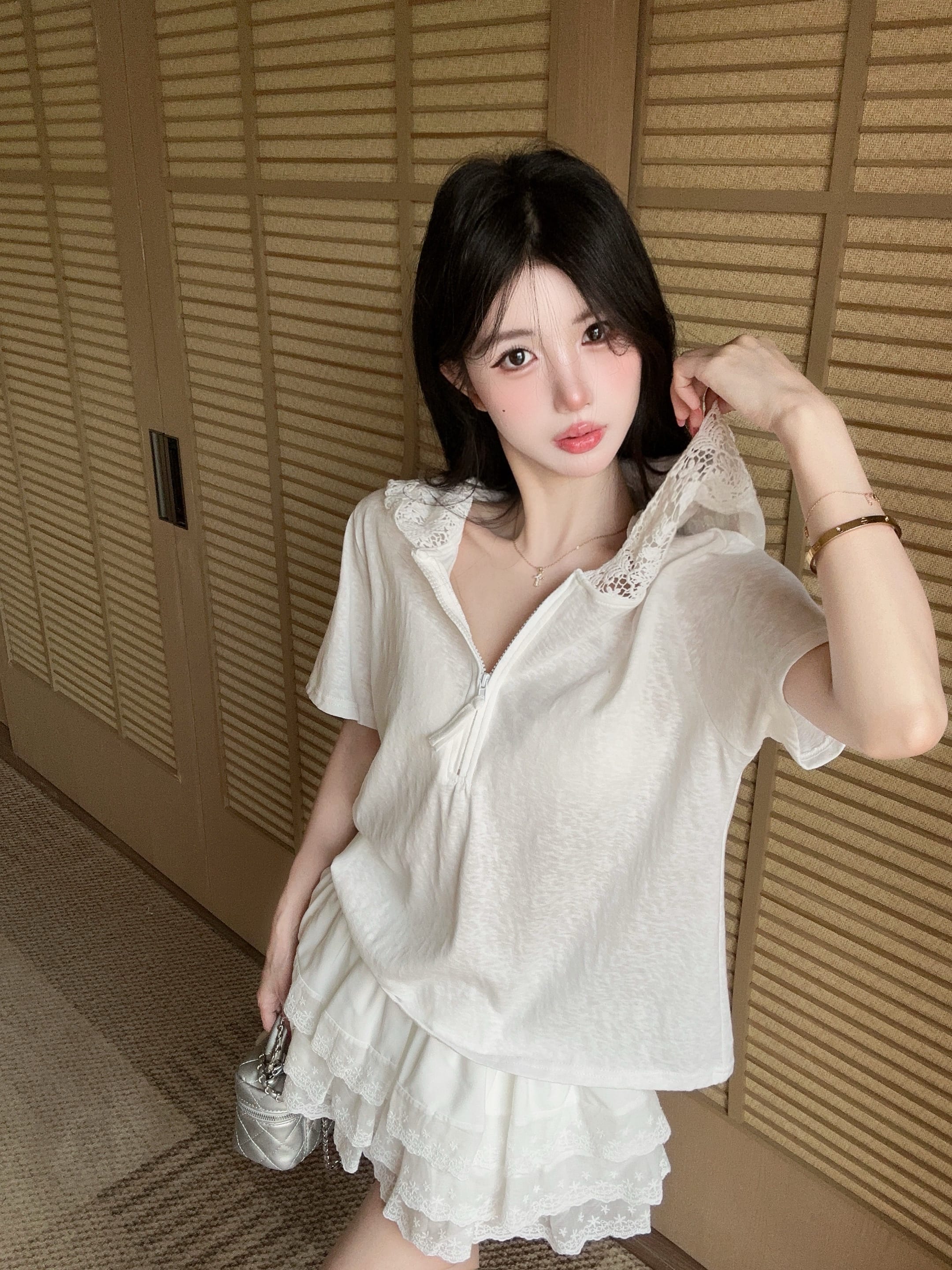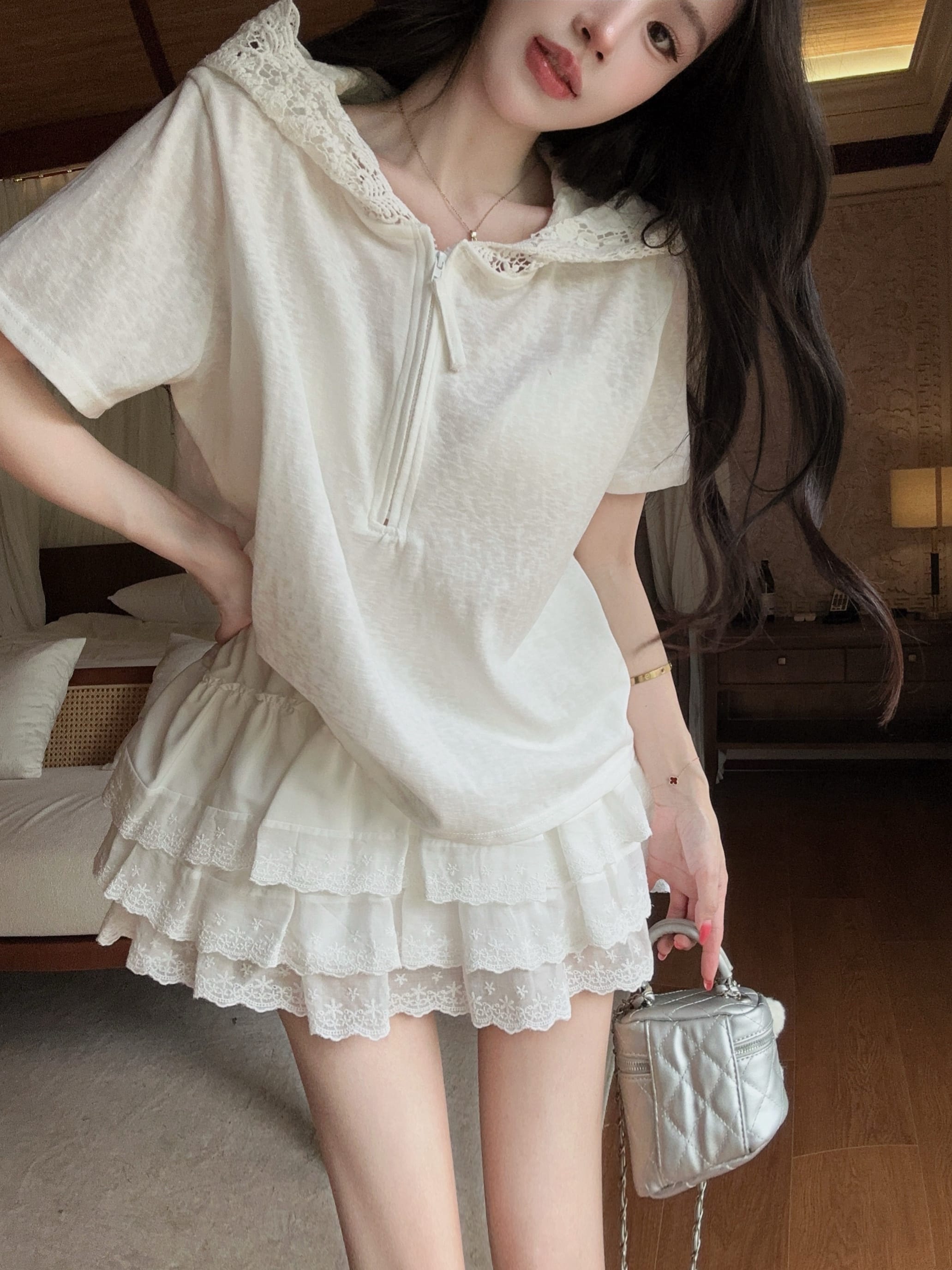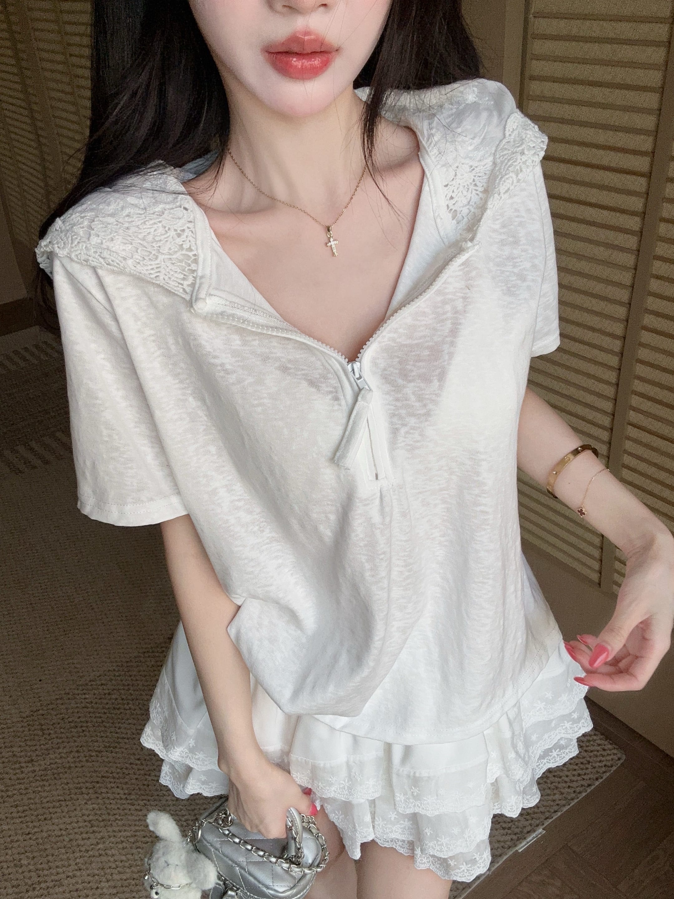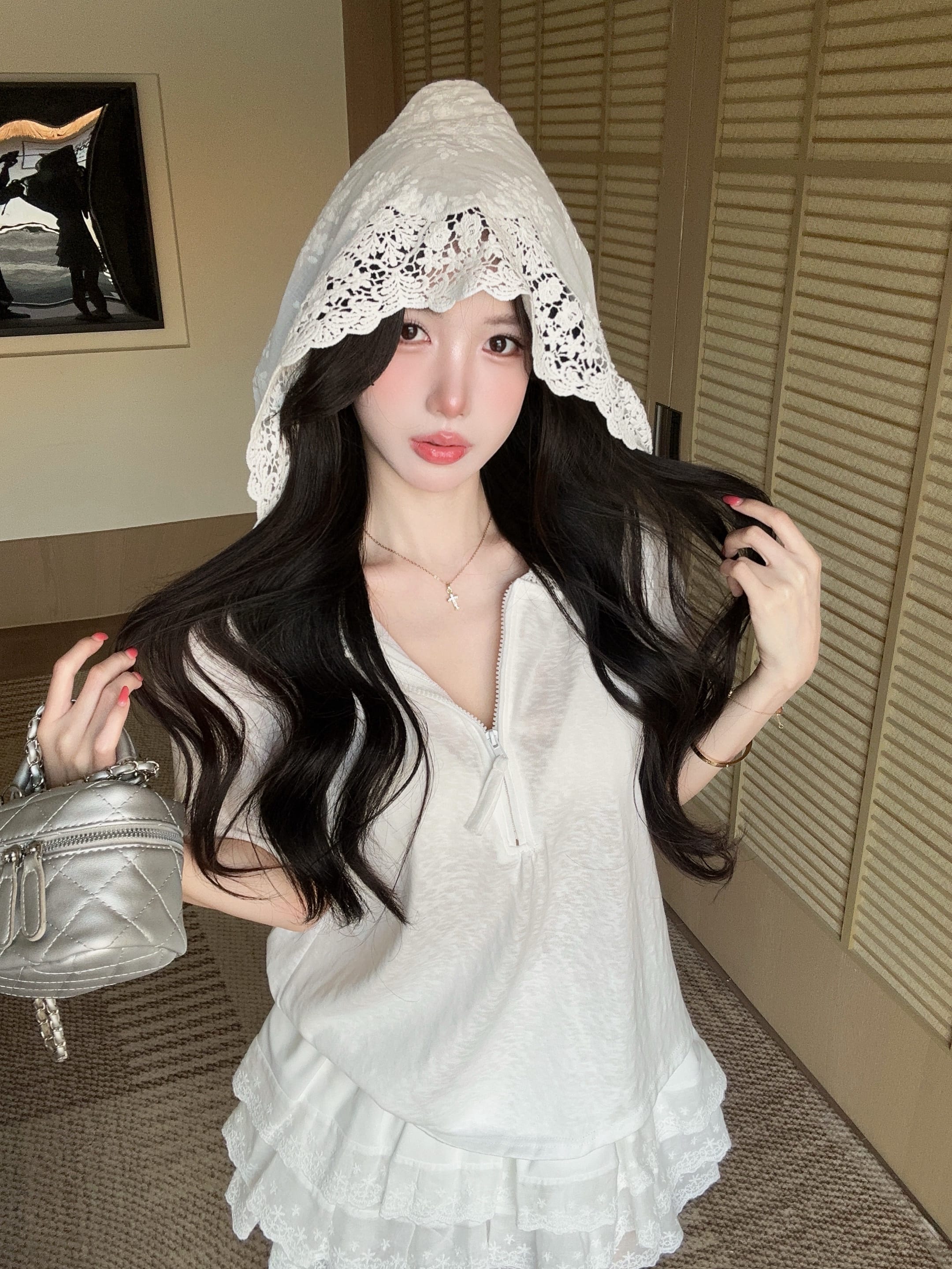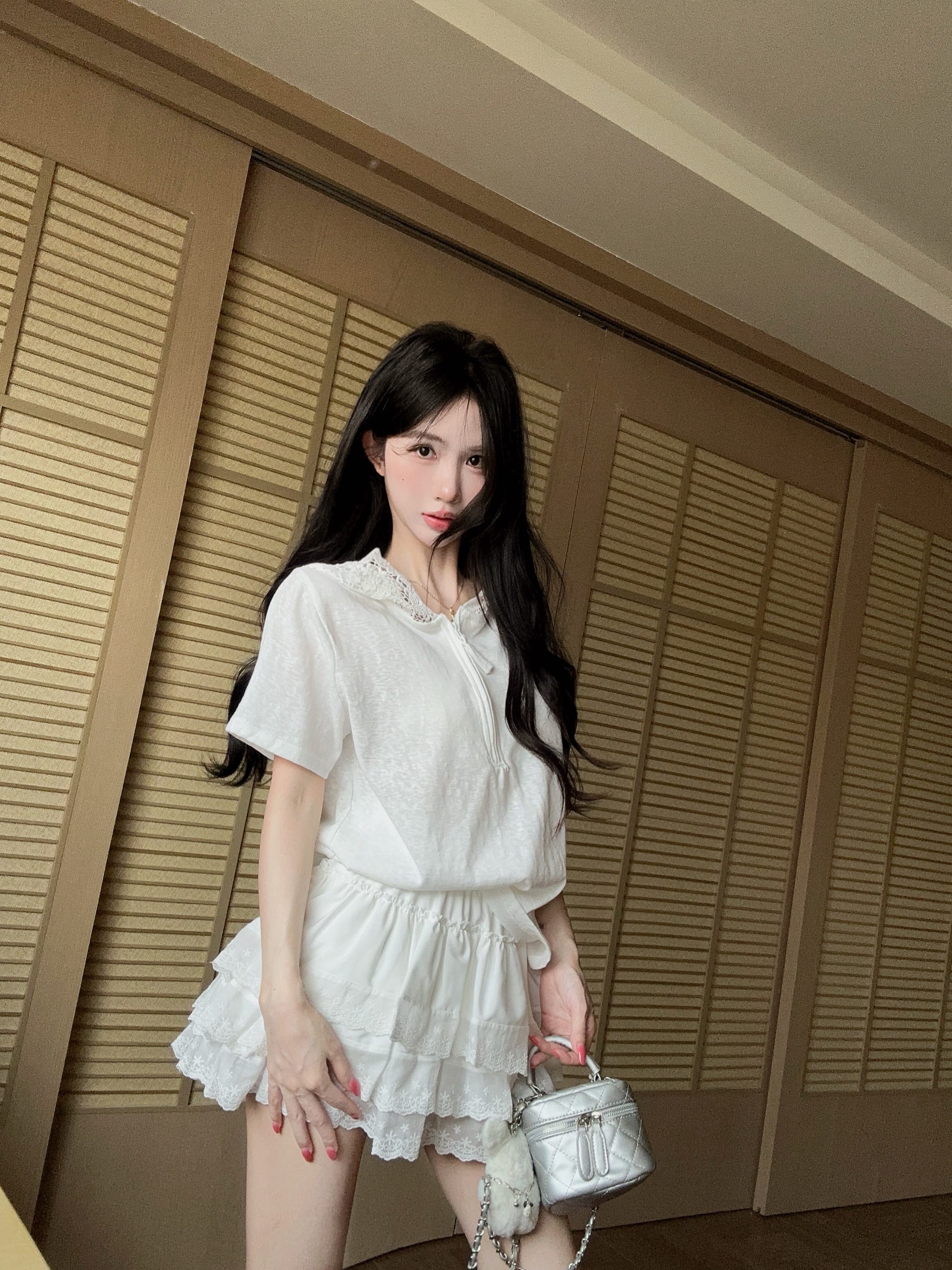 실사 정가 여름 레이스 측면 반팔 대나무 마디 면 후드 티셔츠 레이스 레이스 치마 미니 스커트 투피스 슈트