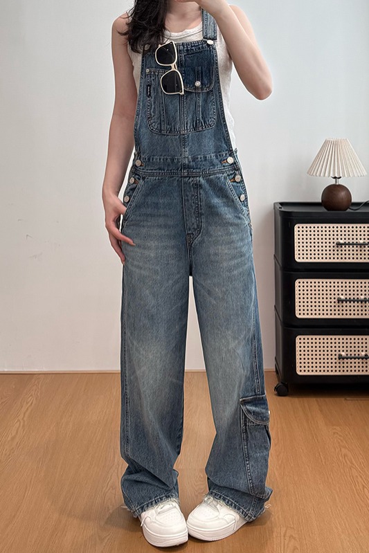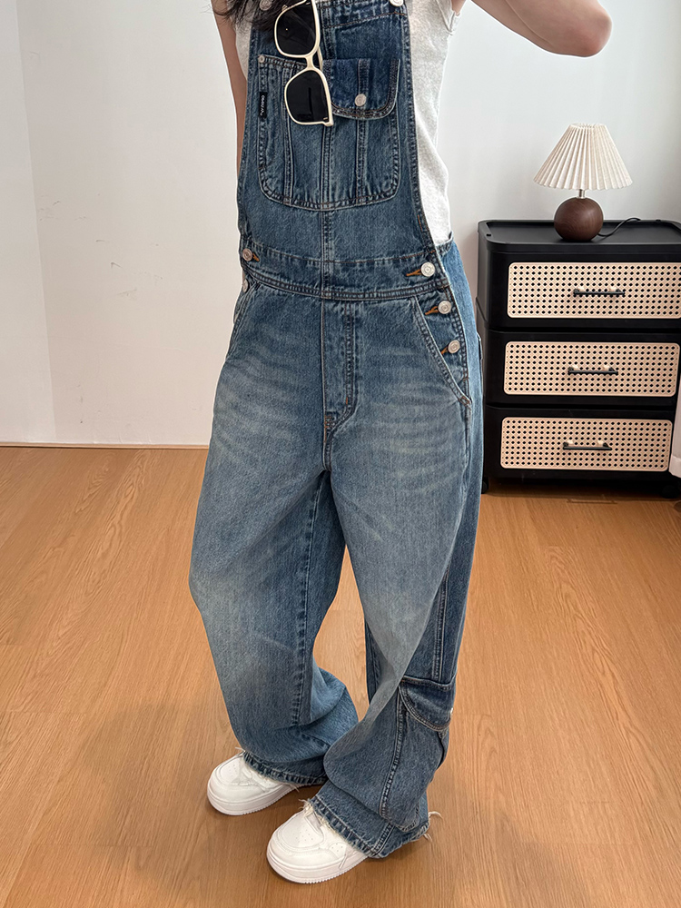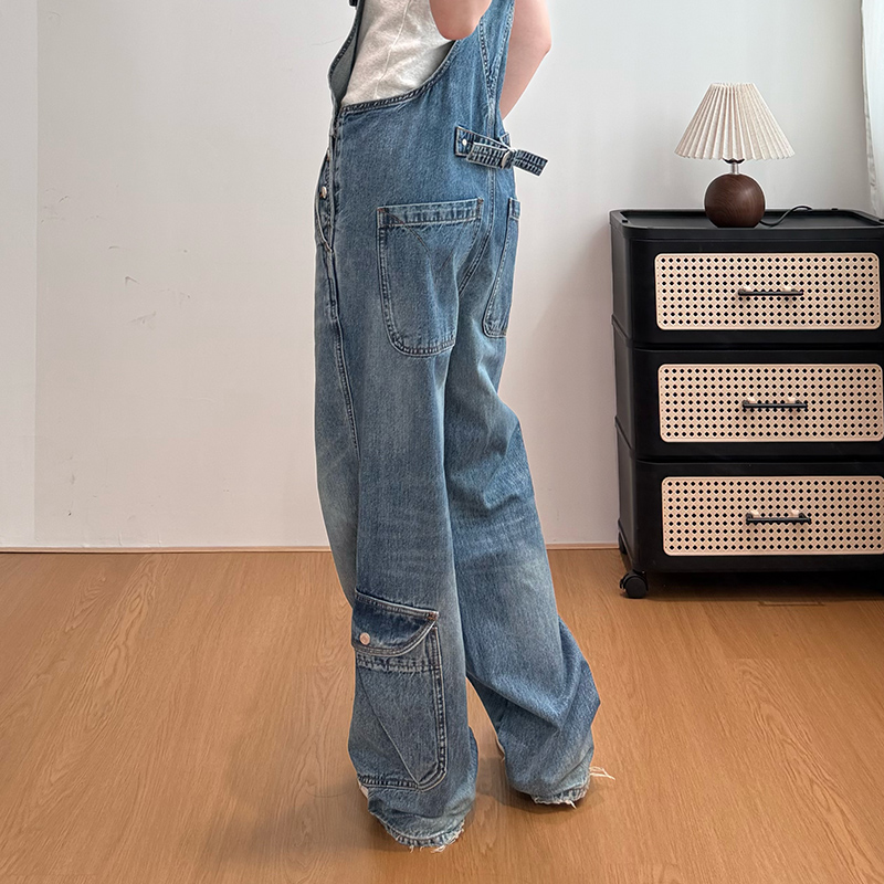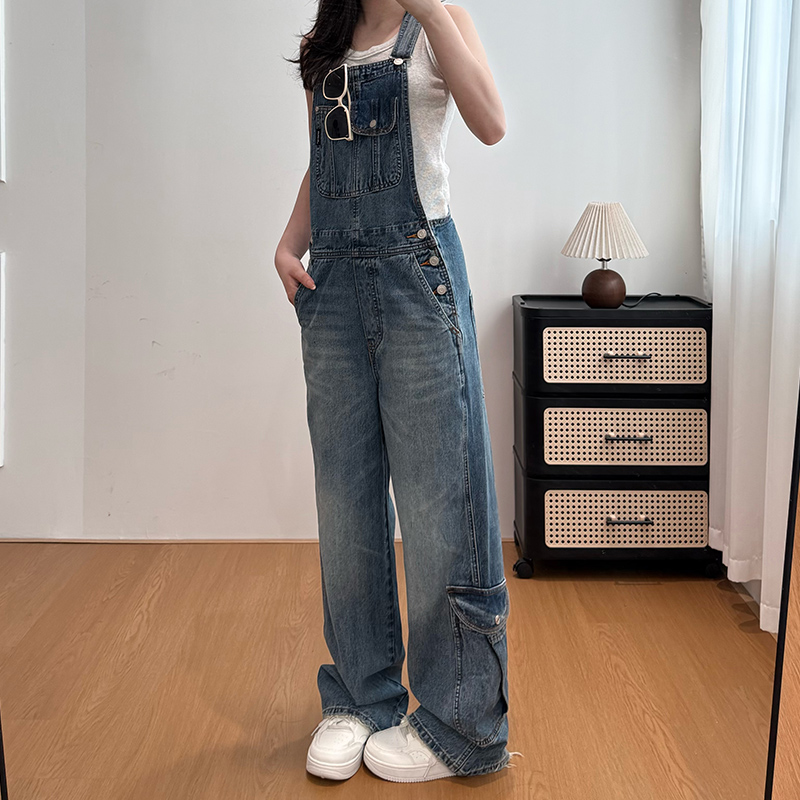 실사 워크웨어 바람 멜빵 바지 스트레이트 청바지 여성 루즈핏 캐주얼 연령 감소 올인원 바지 넓은 다리 길이 바지 여름